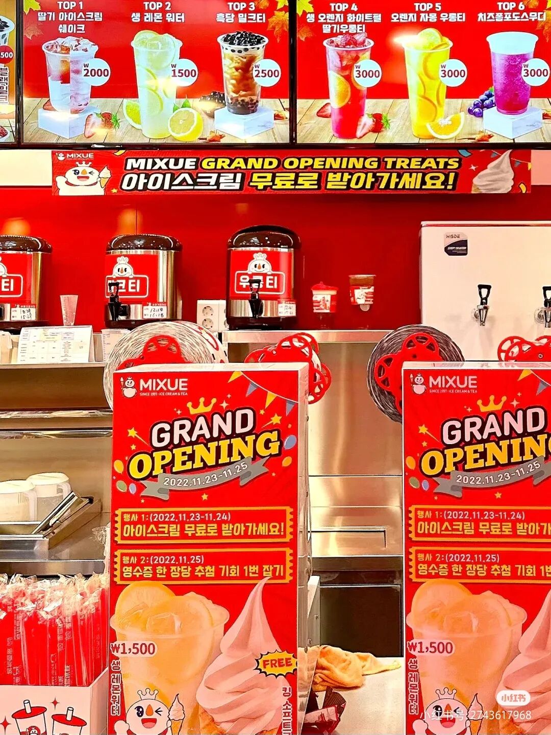 满屏的感叹号,哈喽!日本!我来啦!mixue登场!!!,配合全世界20000店铺以上展开中的野心宣告字幕,这般激情澎湃真的有吵到我的眼睛。每一扇门都挂上了宣传图,雪王的IP形象和经典单品一目了然。