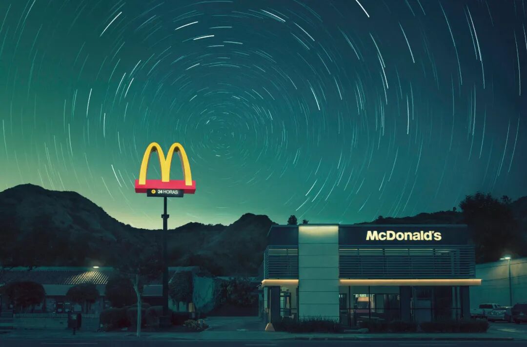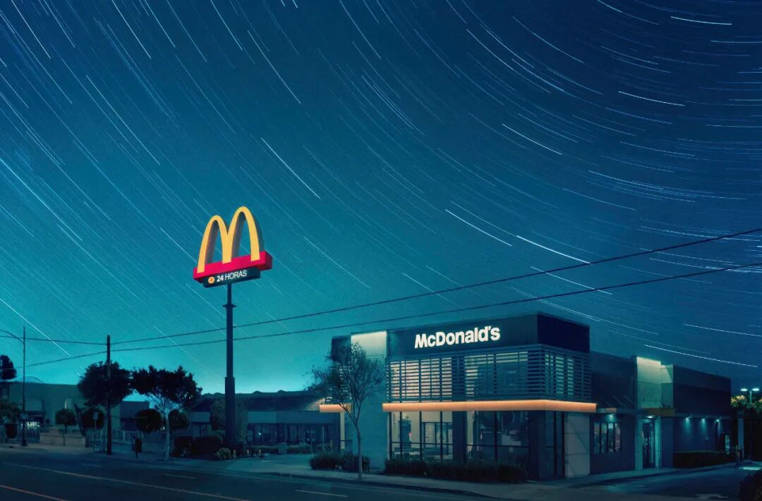 城市、山区、海滩,一张长时间曝光的照片表达一个晚上的时间流逝,而前面刚好有一家麦当劳餐厅,既充满了浪漫又非常治愈!