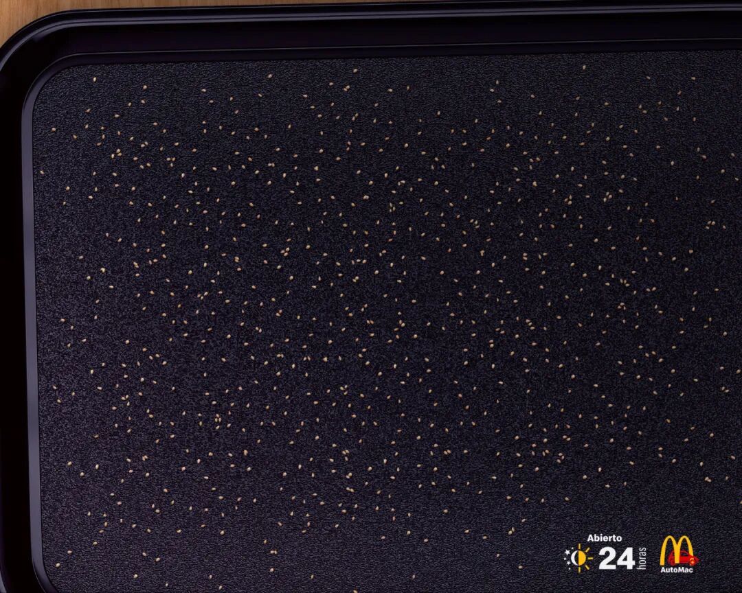 以“托盘”为创意元素,巧妙的化身星空,月亮,日出,芝麻像洒在夜空闪耀的星辰,而圆形的咖啡是散发着暖色光芒的太阳,来体现麦当劳的24小时营业!