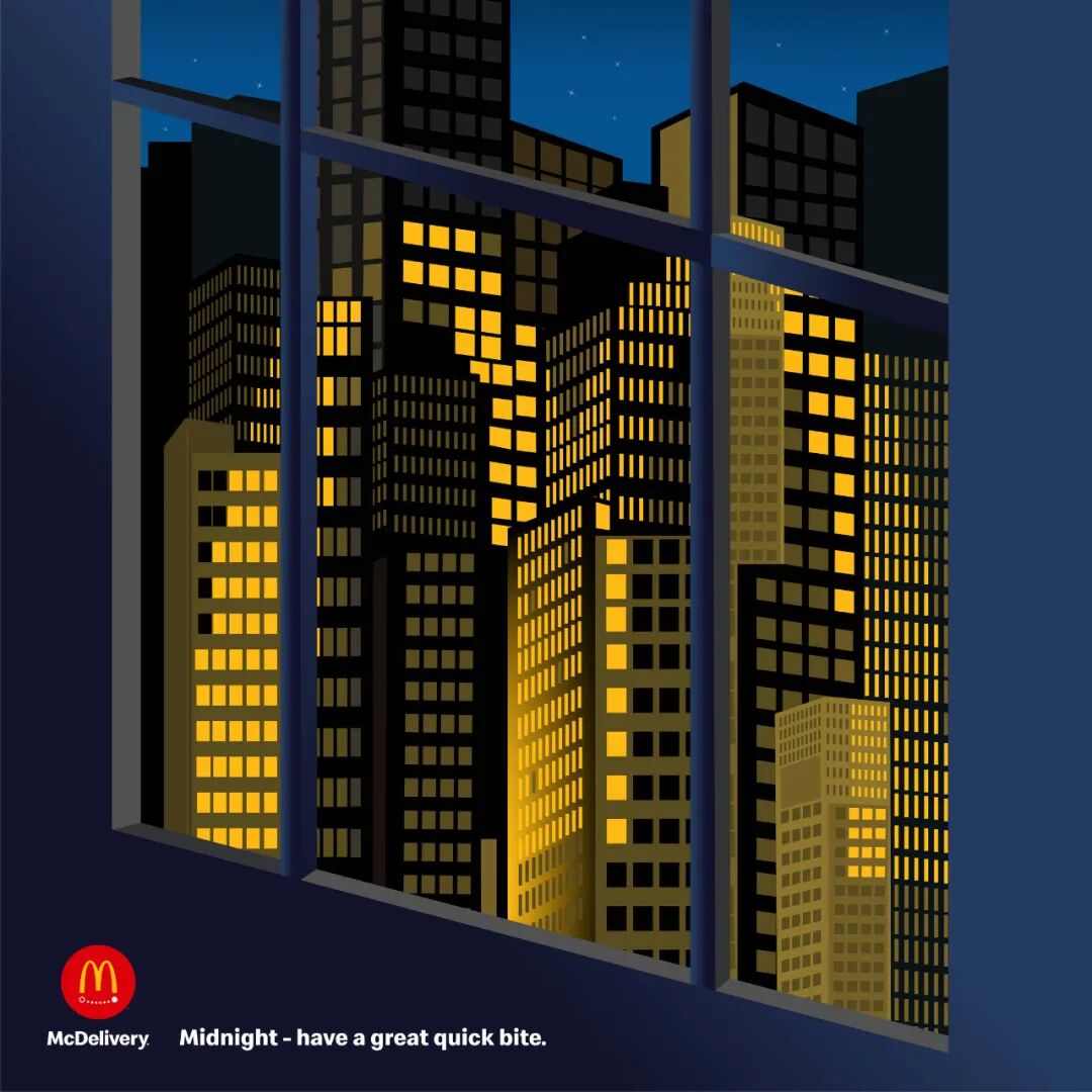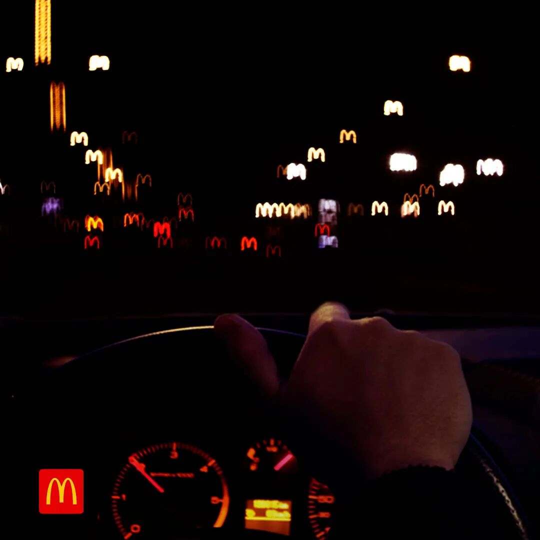 夜晚时分,亮起的灯都是麦当劳的造型,错位视觉的效果!