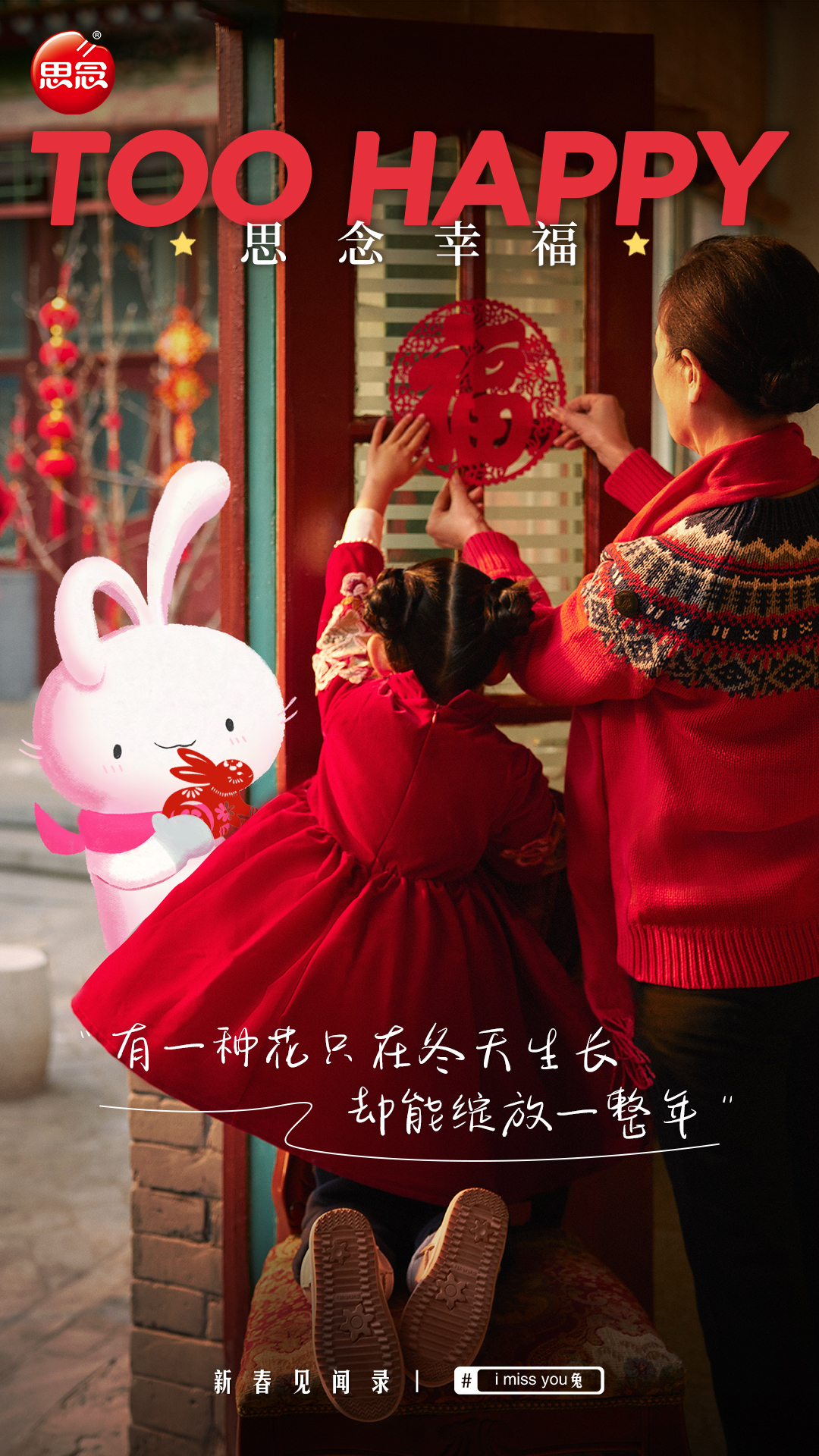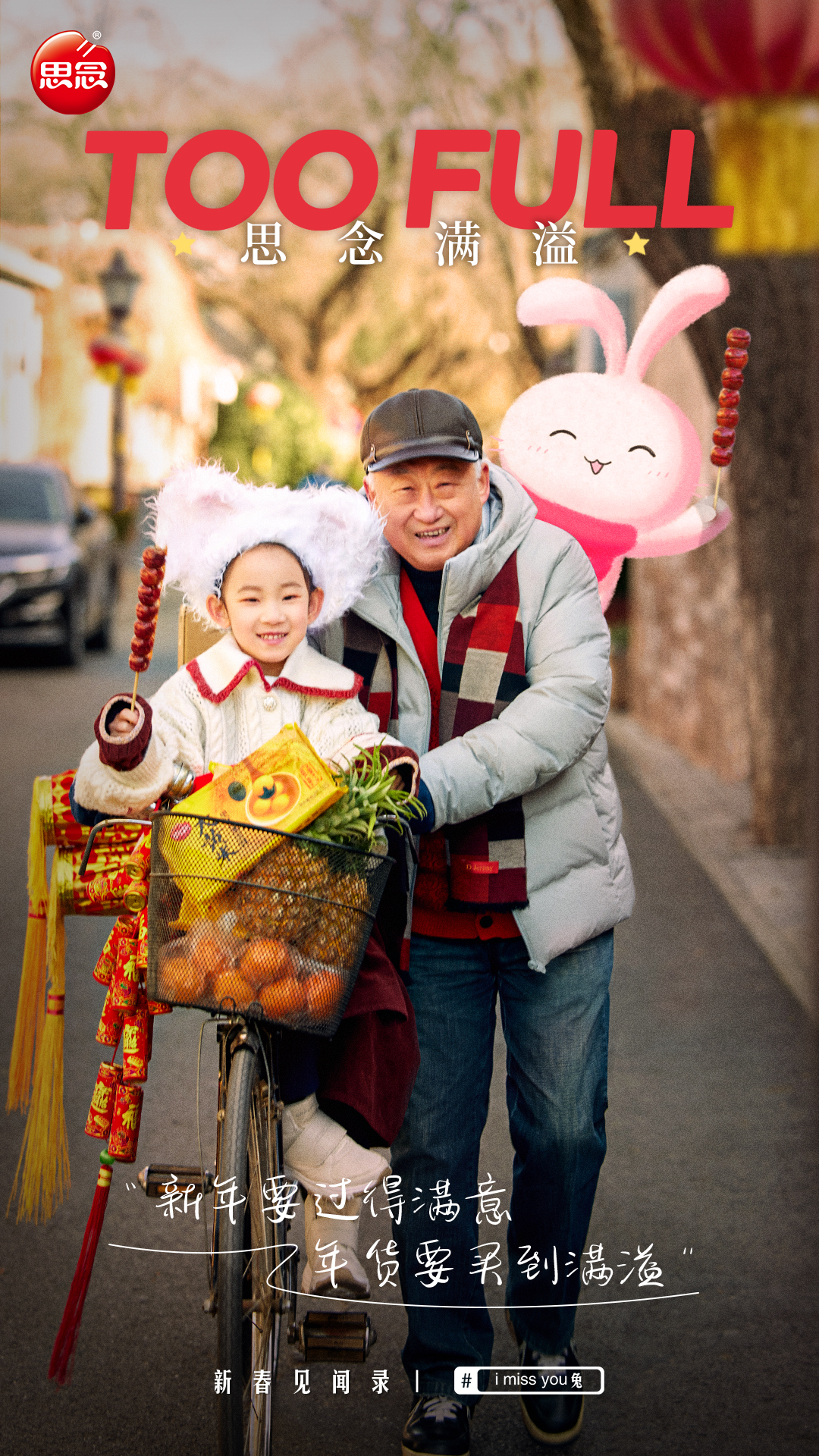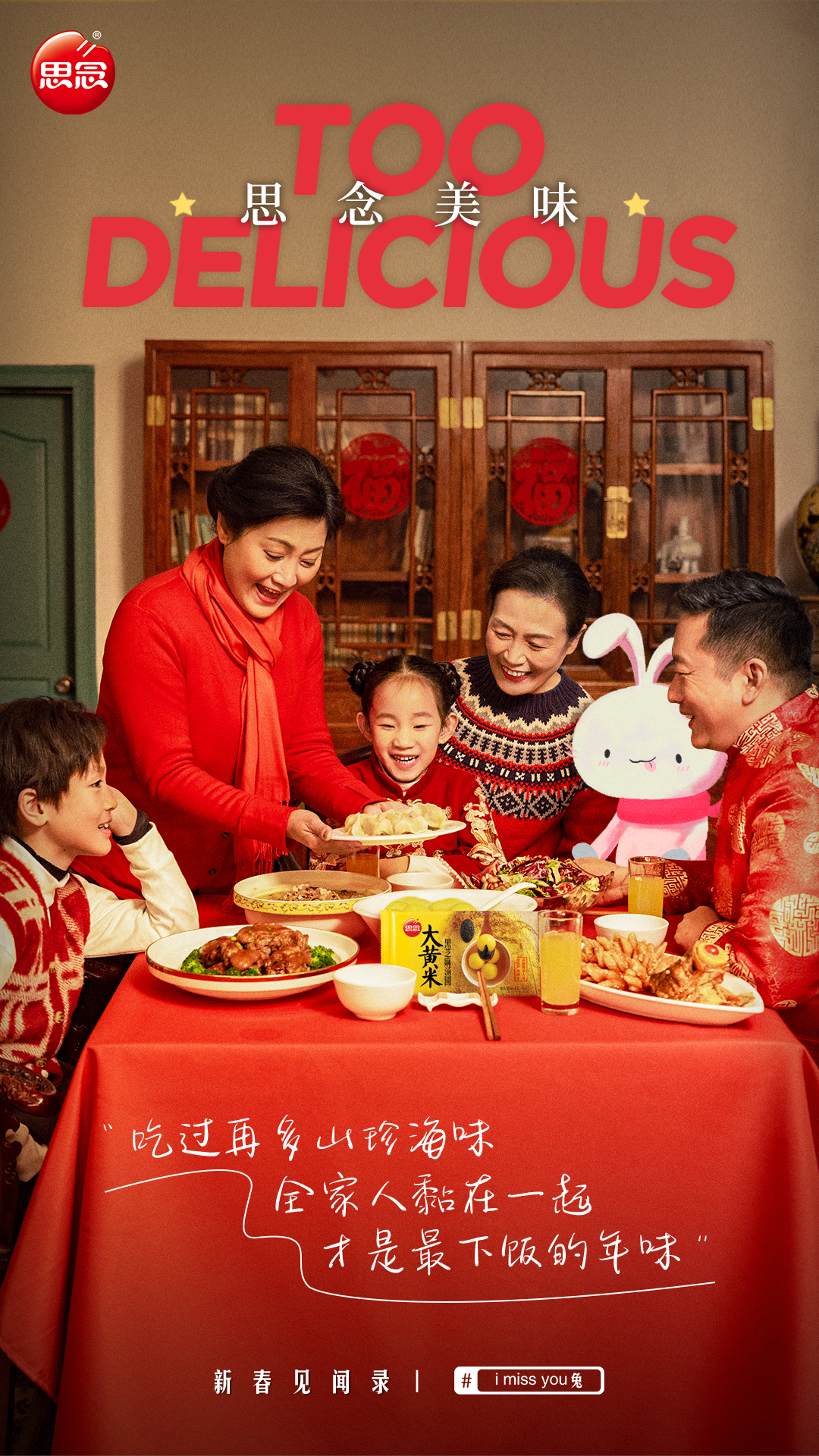 “小白兔白又白,两只耳朵竖起来;爱吃萝卜爱吃菜,蹦蹦跳跳真可爱。”这首发行于2004年的儿歌,语言活泼,朗朗上口,曾是很多小朋友童年喜欢的儿歌。 可是,随着这些小朋友慢慢长大,这只他们从儿歌中幻想出来的小兔子,却渐渐被遗忘了。思念食品营销的情感出发点,就是希望用这支儿歌,让人们回忆起童年的美好,追忆埋藏在内心深处的年味。 为此,思念食品邀请到了文案女神林桂枝操刀写词,中国香港著名创作人陈光荣编曲,改编了这首家喻户晓的童谣,并联合知名脱口秀演员李雪琴出演了创意短片《i miss you 兔》。