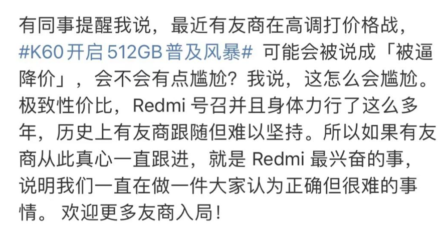 降价的同时,卢伟冰还发微博表示,其实内部也料到会被说成“被逼降价”,但并没有觉得尴尬,欢迎更多友商入局性价比竞争。