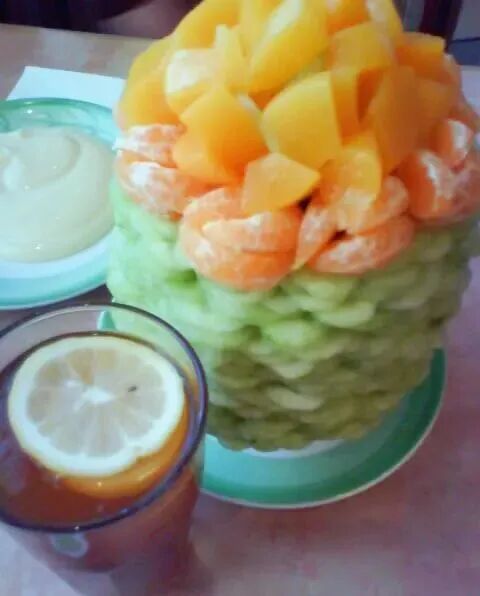 他们喜欢扶着盘子,像是堆积木一样把黄瓜、黄桃、橙子一层叠一层地堆起来。