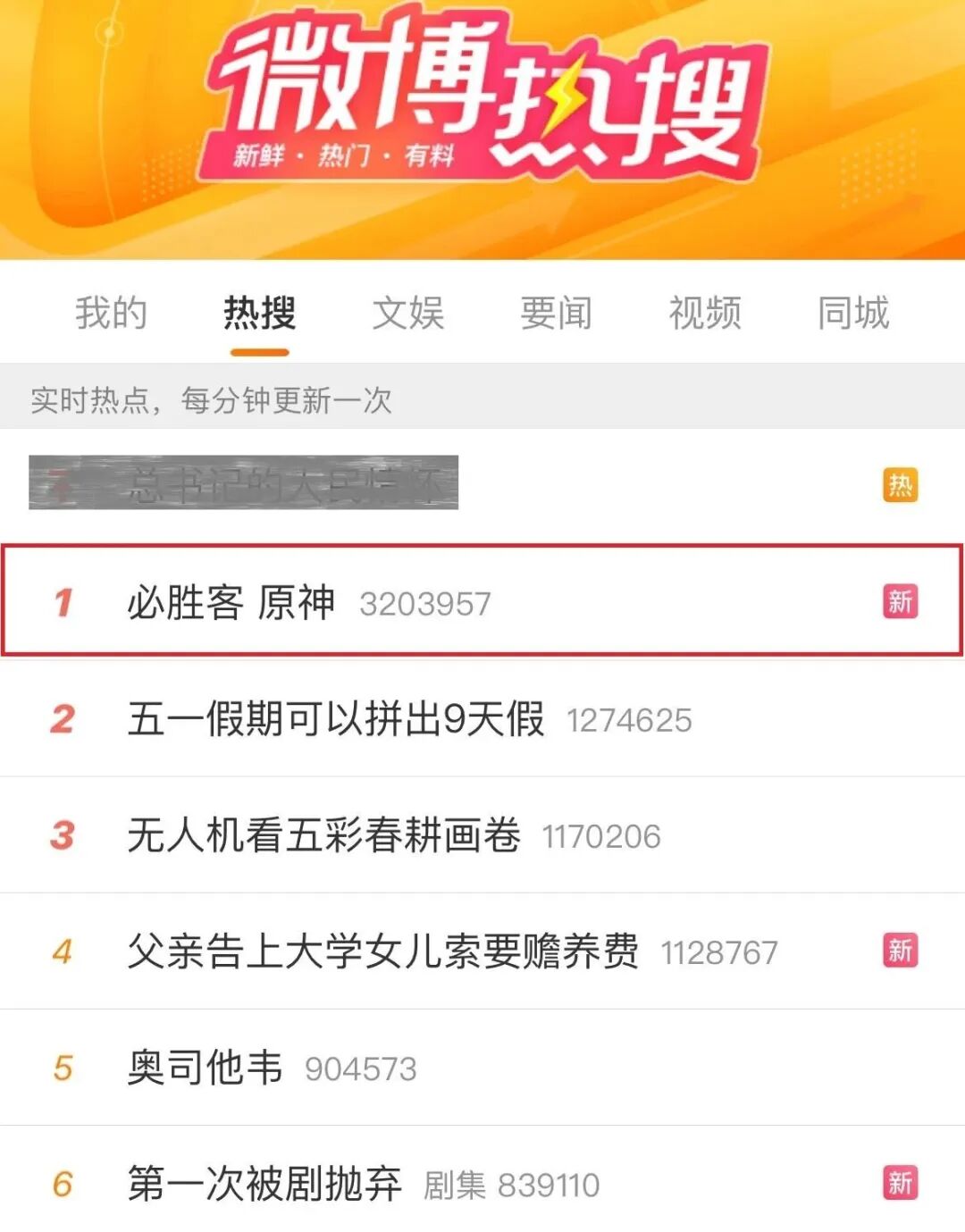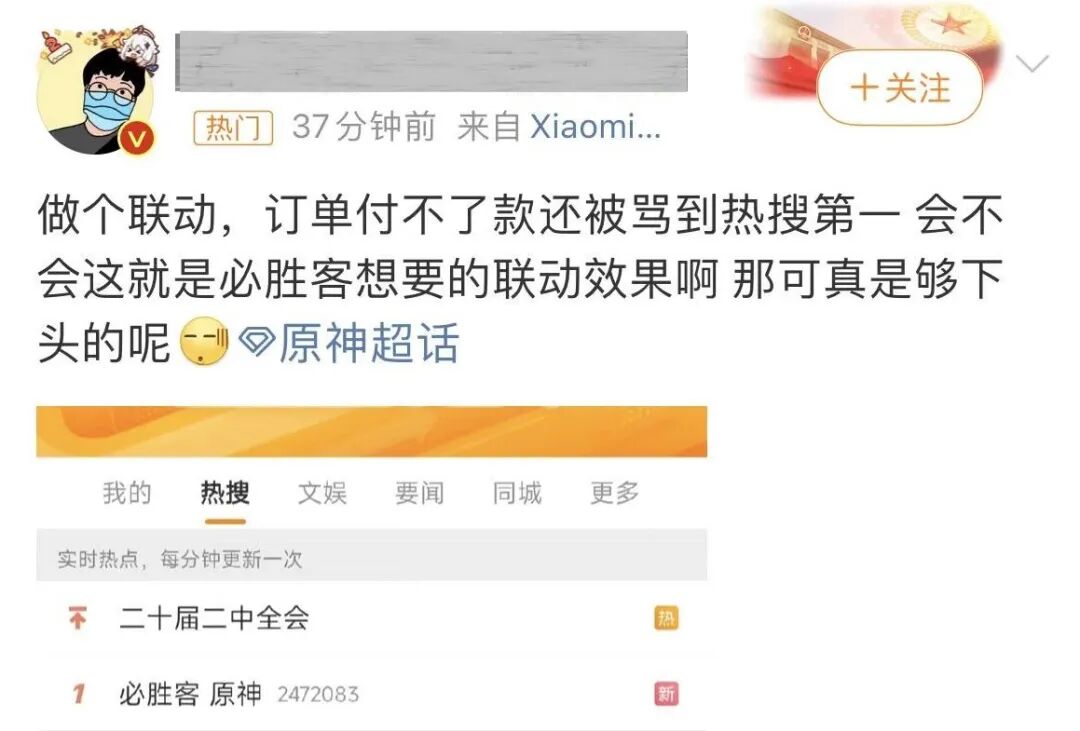 #必胜客 原神#的词条赫然排在微博热搜榜第一的位置!