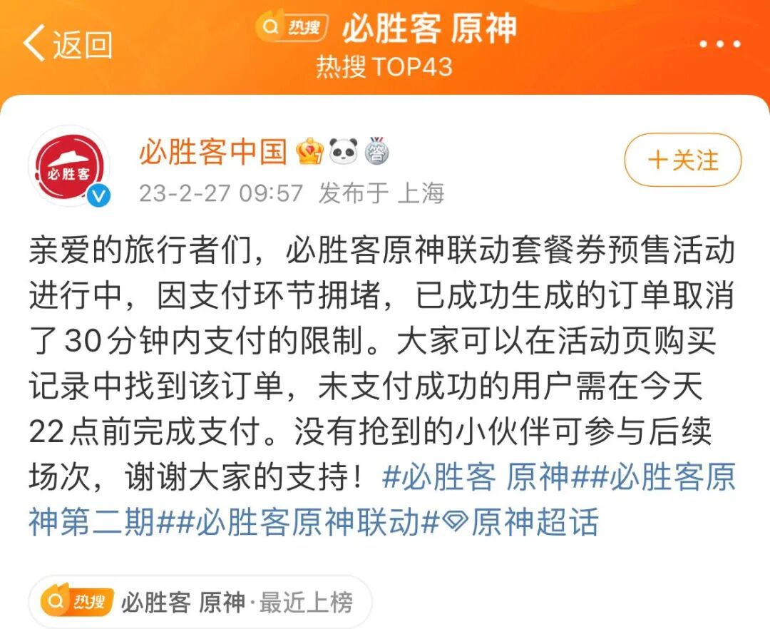 原来,必胜客×原神联动周边套餐预购原定于今天(2月27日)9:00开启,但无数网友表示必胜客App崩了 ,订单一直无法支付,于是跑到微博上@必胜客要说法: