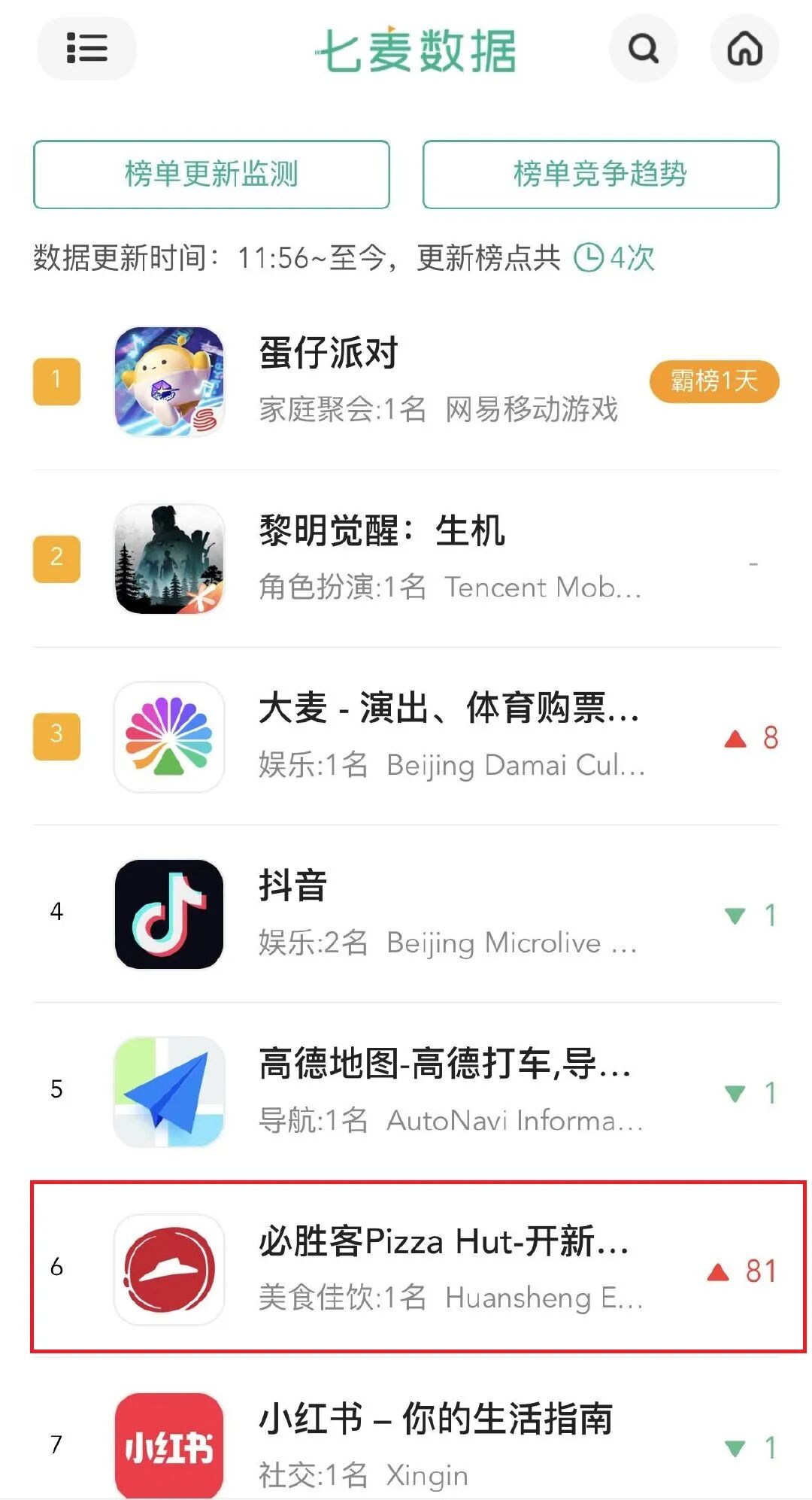 到了下午有网友提供了“新的佐证”:必胜客联名被骂上热搜之后,必胜客APP的排名开启狂飙模式,从冷门APP挤进了前十!