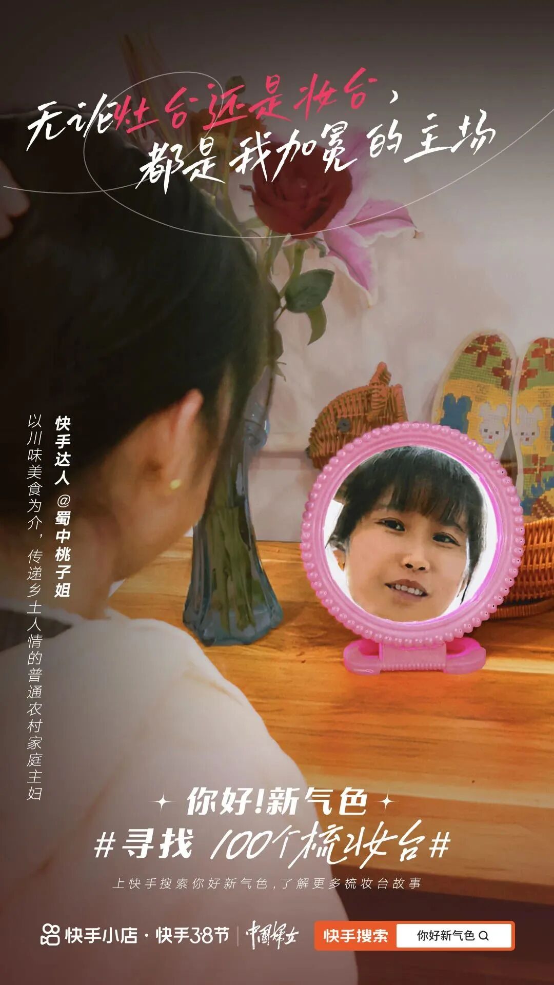 另外快手小店携手《中国妇女》杂志社还发起“你好!新气色”#寻找100个梳妆台#活动,这些所征集到的各类梳妆台,让我们看到了新新女孩的百态人生,无论是餐桌的一角、窗台,还是汽车的后视镜,都是新新女孩向往美好生活的“备赛场”,展现了她们的自信魅力,以及向往新生活的态度。
