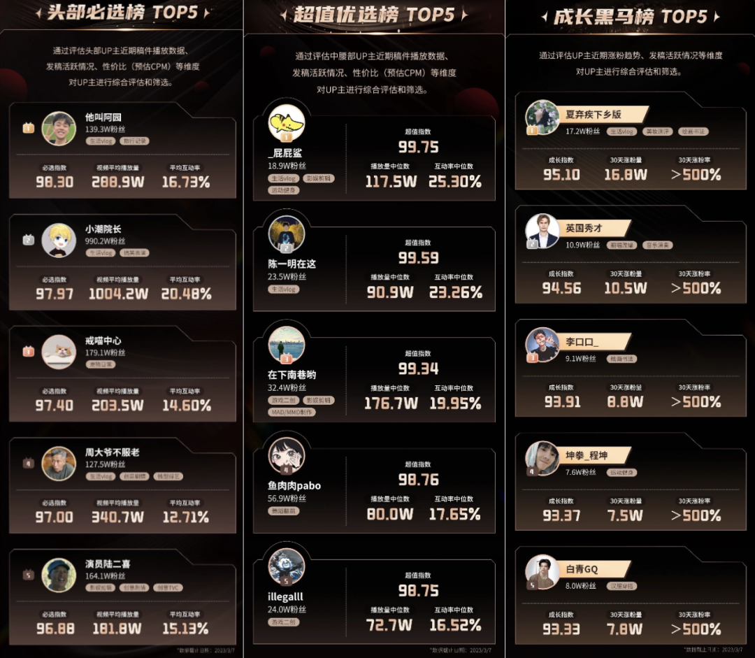 头部优选榜综合了头部UP主近期稿件播放数据、发稿活跃情况、性价比(预估曝光成本)等维度,除了UP主的粉丝数、内容标签、榜单着重显示了视频平均播放量、平均互动率,并给出了“必选指数”。超值优选榜则综合了中腰部UP主近期的相关数据,区别则是显示UP主的播放量中位数和互动率中位数,给出“超值指数”。成长黑马榜则展示中小UP主的近30天涨粉量和涨粉率,给出“成长指数”。
