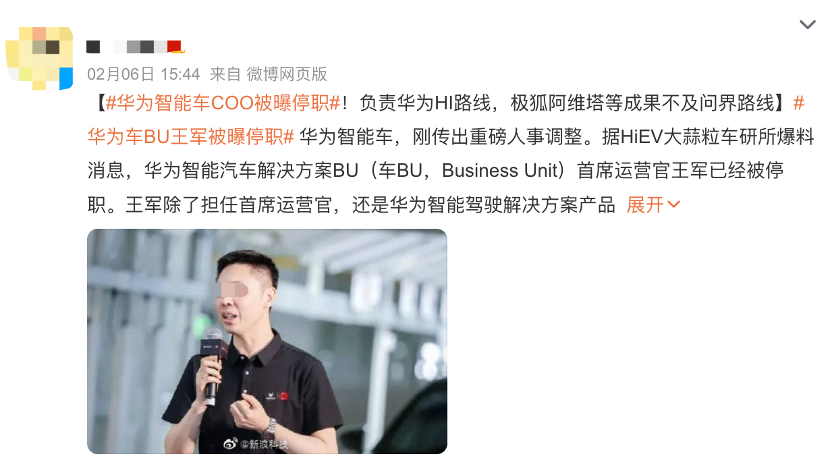 如果说1月份是大环境不好,新能源车企都在跌,问界跌也可以理解。但在2月份,行业都已经普遍复苏,一众品牌销量都在环比上涨了,经历一轮降价的问界销量还在跌,那就很尴尬了。那么我们往回看,去年11月,问界在连续3个月破万销量后,就罕见地出现了销量的环比下降。尽管在12月销量又重新破万,但那是年底冲量的结果,不具有普遍意义。毕竟对于消费者而言,真正想要看到的是挂着华为Logo的汽车,哪怕它的名字叫问界,而不是空有华为之名。真要算起来,问界和华为的关系,甚至连当年的荣耀手机与华为都比不上。而问界在借着华为的品牌和渠道收割了一年之久后,品牌被严重透支,销量崩盘也就不奇怪了。也很简单,继续强化华为元素,把问界和华为捆绑在一起,以拯救问界的销量。而过往历史也证明,每一次强化华为元素,销量就能迎来一次起飞。但事情到这里还没完,对于华为而言,“HUAWEI问界”还有着更重要意义。先科普一个小知识点,除了零部件模式外,华为的造车模式主要分为两大路径:一是由华为主导的智选车模式,问界就是其中代表;一是由车厂主导,华为提供解决方案的HI模式,如北汽极狐、长安阿维塔。HI模式的结果大家都看到了,无论阿维塔还是极狐,销量都少的可怜,前负责人王军更是被强制停职,这条路暂时还没走通。▶ 图源:微博