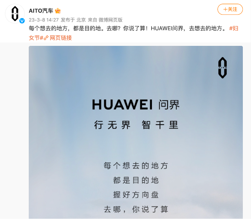 最近几天,“华为”出现在我眼前的频率明显高了起来。一会儿是起诉小米,一会儿是传言出售手机业务,一会儿又是华为P60未售先火,但最让我关心的,还是有关华为造车的事。3月8号,AITO汽车发布了一条微博:“HUAWEI问界,去想去的地方”,并附上了如下海报。▶ 图源:AITO汽车官方微博
