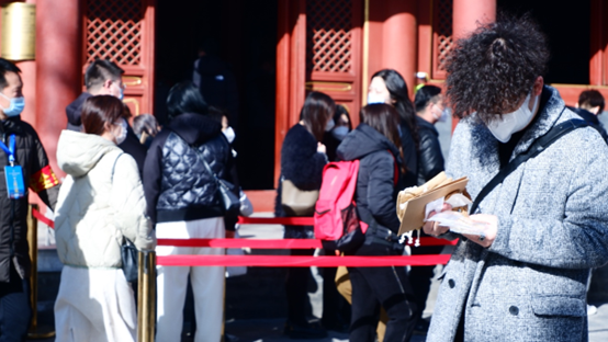 周三上午八点,雍和宫门口已经出现了排队的年轻人。此时离9点开门还有一小时。