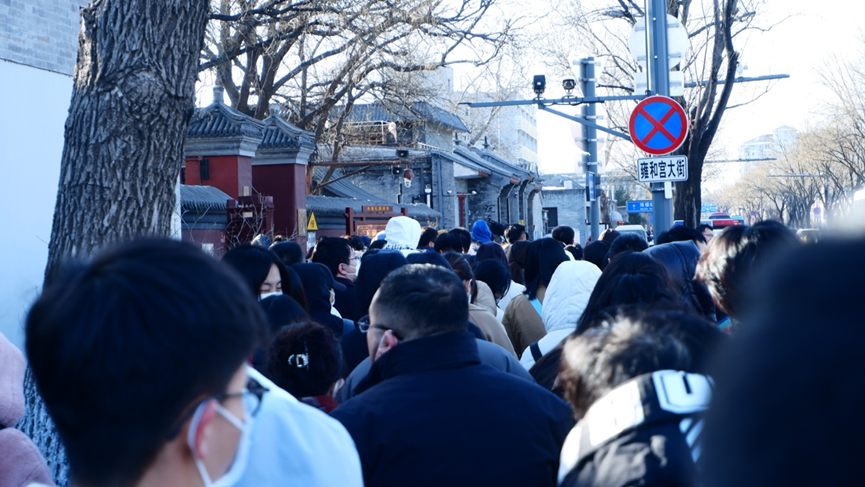 工作人员出来维持秩序,队伍即便被分成了3条,人群仍然挤到了150米开外的地铁口。雍和宫的香灰,旺到在地铁站内都能闻到阵阵香火味。