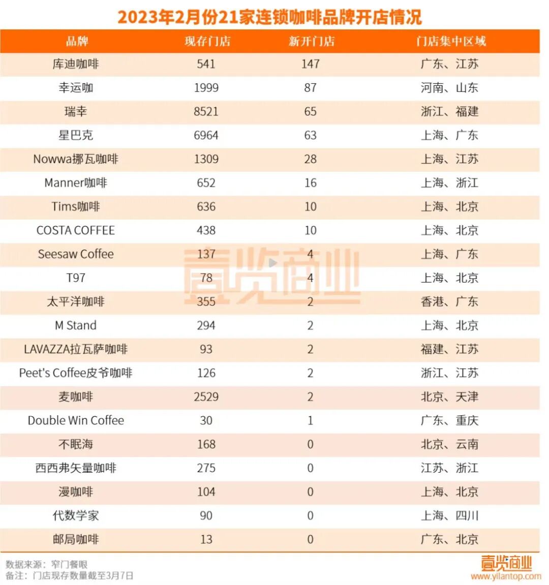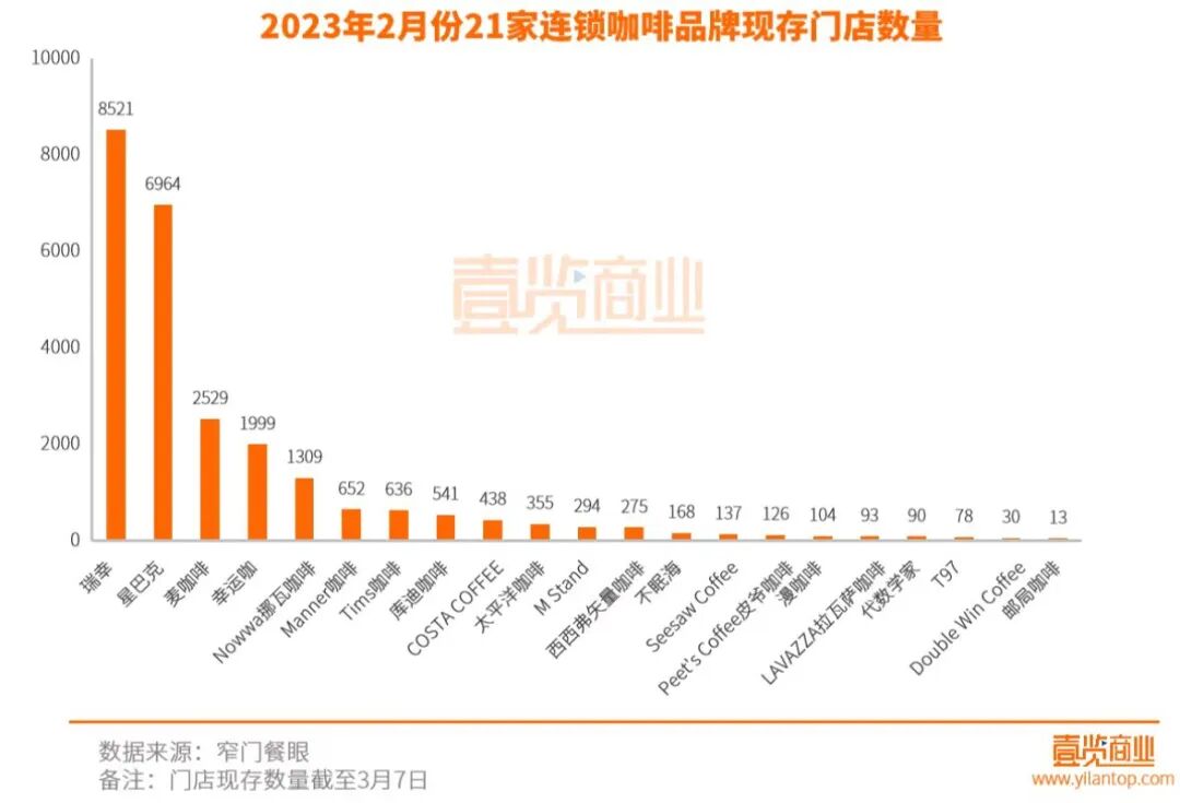 据壹览商业统计数据显示,截至3月7日,21家连锁咖啡品牌现存门店数量达25352家,其中瑞幸现存门店8521家。