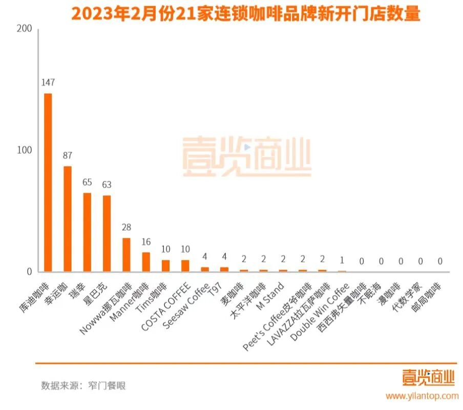 据壹览商业统计数据显示,2月份库迪开店147家,新开门店排名第一,而1月份开店最多的是瑞幸,2月瑞幸仅开店65家,仅为库迪2月开店的一半。咖啡行业从来不缺挑战者,而库迪直接将枪口对准了瑞幸。