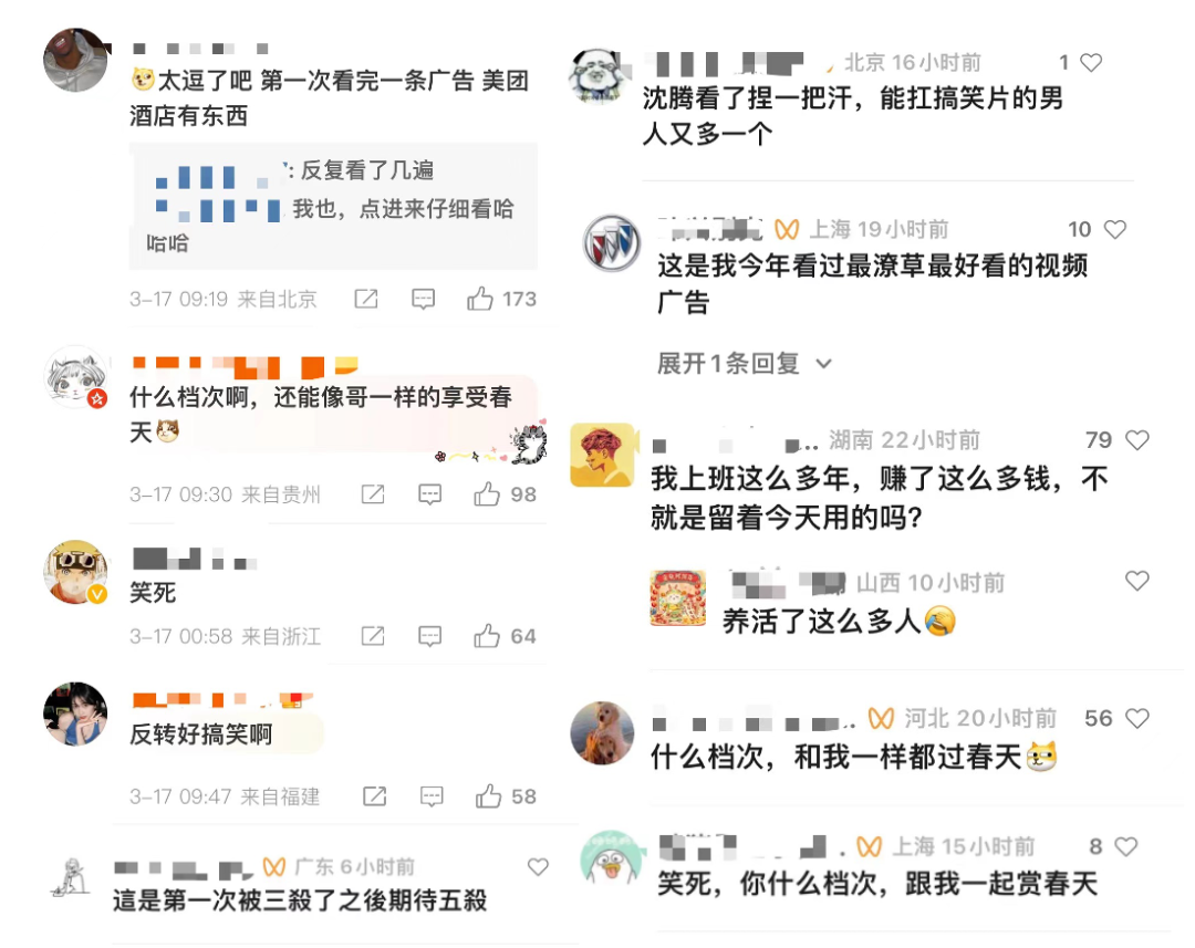 而在美团的这支广告中,热梗“当事人”贾冰用了仅仅1分钟,就凭借他独特的“贾式幽默”还原出了“徐江”的黑帮大佬感,干脆利落,没有多余的镜头,每一帧都是表情包。用三段从「自我陶醉很丰满」到「认清现实很骨感」的反差剧情,不断强化观众对“美团酒店春游套餐折扣”的记忆点。