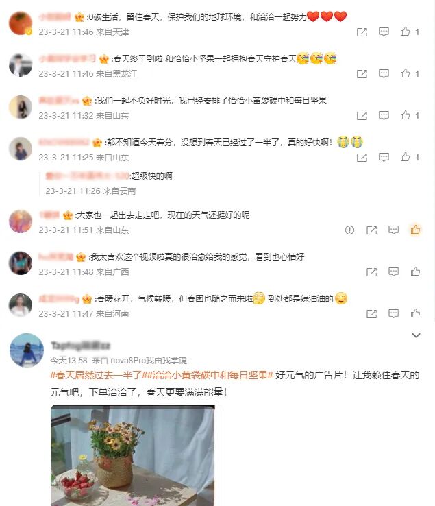 可以发现,原本春分这一天,微博上就有不少关于春天过半的话题,甚至还登上了热搜。可想而知,洽洽在这样的时间节点抛出与人们在社交媒体上讨论的话题一致的品牌短片,其内容不仅很容易被关注的人看到,也更容易成为人们讨论的中心。
