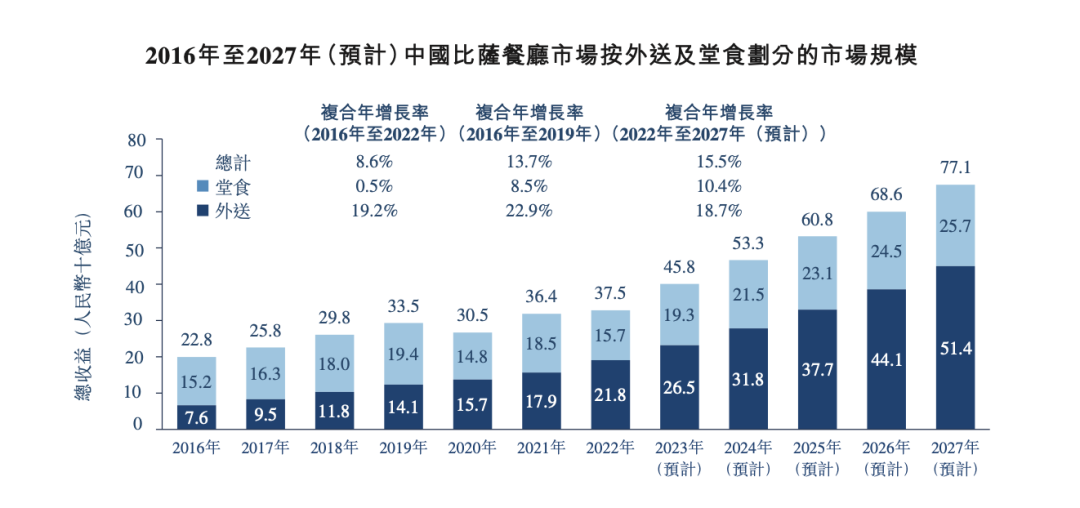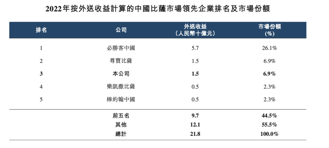 弗若斯特沙利文发布的中国披萨市场行业报告显示,预计披萨外送分部甚至将较整个中国披萨市场增长更快:2022年,整体外送比萨销售额为218亿元,占整个中国比萨市场的58.1%;预计2022年至2027年披萨外送分部将按18.7%的复合年增长率增至514亿元,占整个中国披萨市场的66.7%。