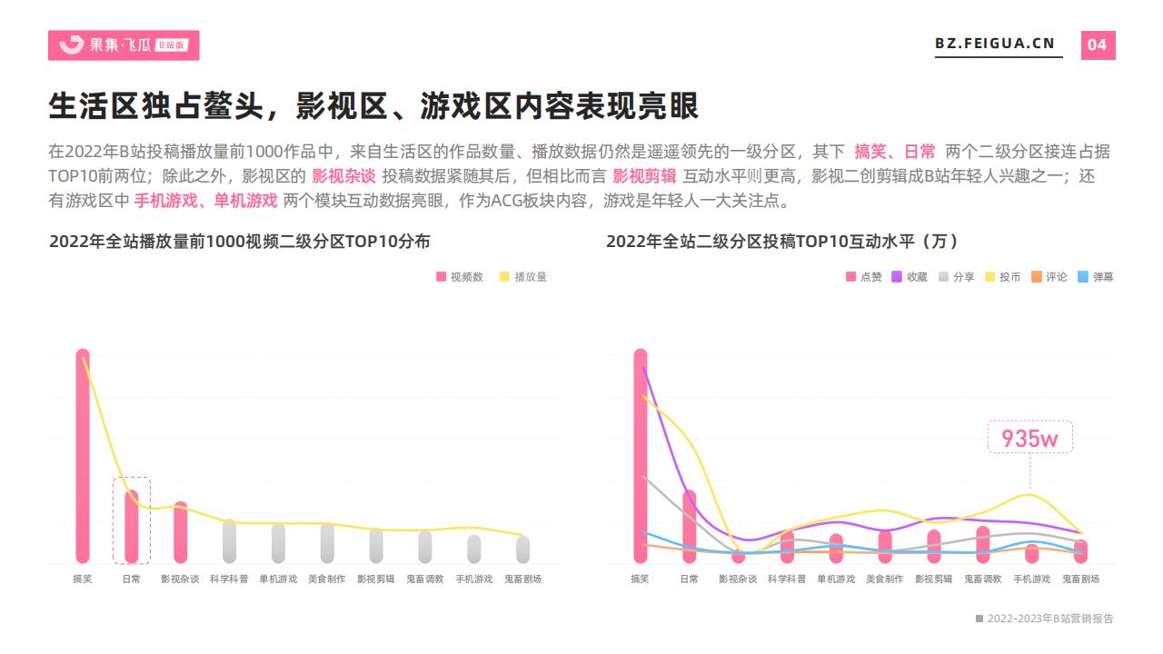 在2022年B站投稿播放量前1000作品中,来自生活区的作品数量、播放数据仍然是遥遥领先的一级分区,其下 搞笑、日常 两个二级分区接连占据 TOP10前两位;除此之外,影视区的 影视杂谈 投稿数据紧随其后,但相比而言 影视剪辑 互动水平则更高,影视二创剪辑成B站年轻人兴趣之一;还 有游戏区中 手机游戏、单机游戏 两个模块互动数据亮眼,作为ACG板块内容,游戏是年轻人一大关注点。