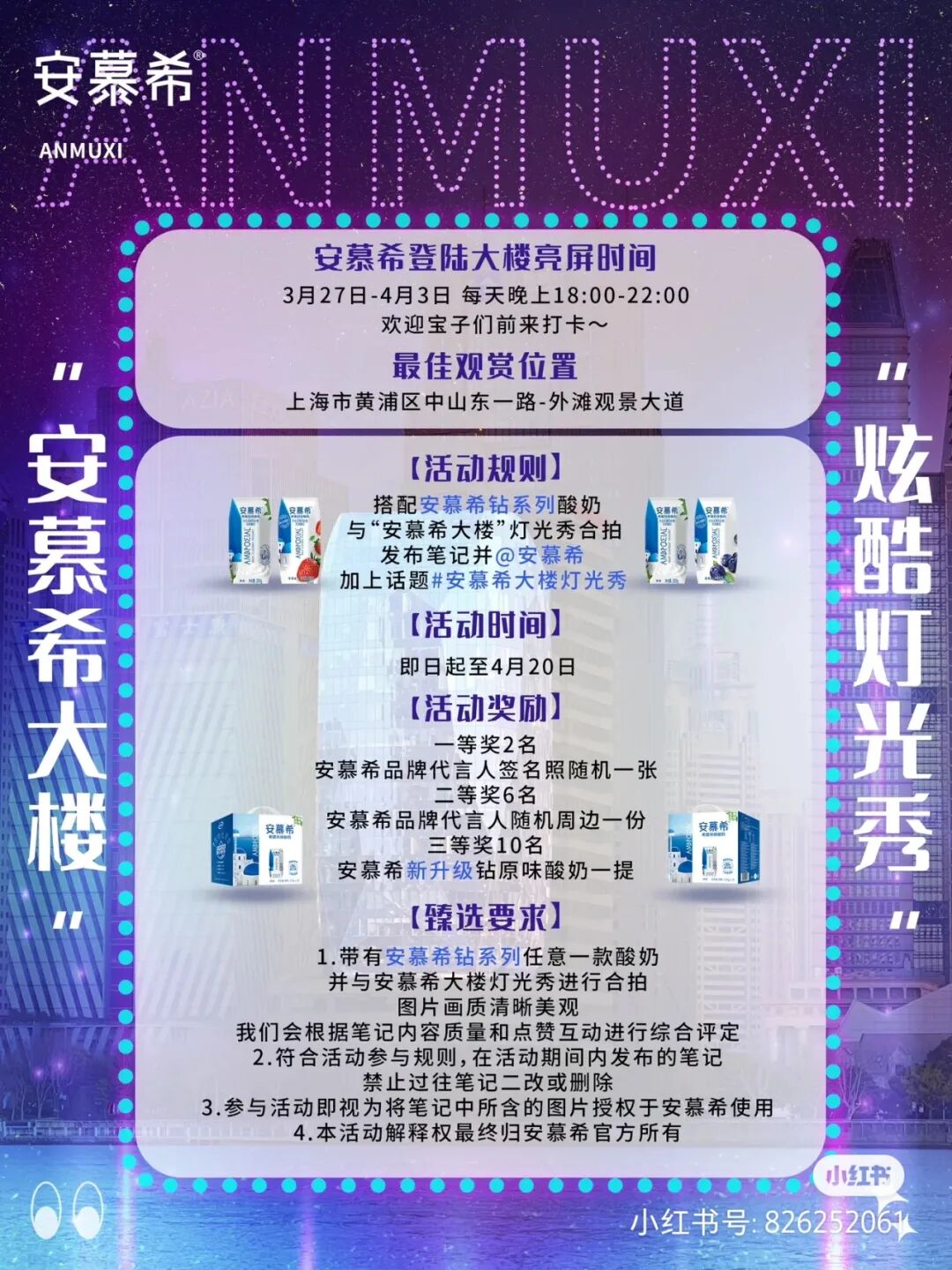 以好玩、有趣的潮流方式与年轻人对话,往往是品牌营销永不失效的创意切入点。而这一场上千万网友参与的活动,安慕希无疑是成功的。它不仅在营销碎片化的时代为品牌聚合了巨大声量,更让年轻人以一种自发共创的形式与安慕希之间搭建起一种新的价值衔接点,而且也帮助自身注入了更加有趣、好玩的品牌质感。当然,这场灯光秀也不简单,这一次安慕希还将酸奶原味品质升级巧妙地通过大楼的连续亮灯展现了出去,并在小红书和微博等平台发起了一次打卡征集活动,鼓励广大粉丝们一起行动起来,在3月27日-4月20日期间带着安慕希钻系列酸奶打卡,拍照发布小红书笔记并@安慕希,参与抽奖活动。