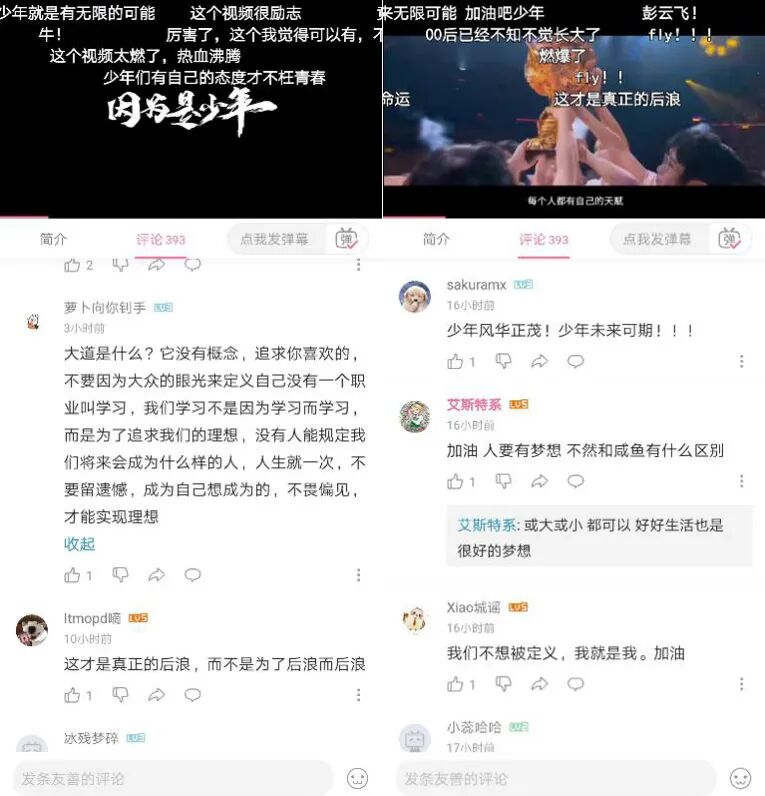 尤其是在年轻人聚集的B站,我们随机选取了一些评论:“总有人能听懂你的声音”“这才是真正的后浪!”“00后也是勇敢的酷少年!加油过自己想要的人生!”“为梦想发光,不屈从命运真的很棒!”