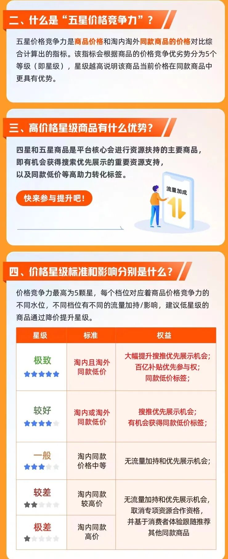 比如,在手淘上线同款比价工具,用户可以直接在页面看到同款商品,淘宝在售多少件、最低价是多少;以及淘宝面向商家推出五星价格力,即平台给不同在售商品的价格竞争力评分,根据档位评价星级的不同,对产品给予不同的搜索、推荐流量;还有平台为“全网最低价”商品提供首页搜索展示等。