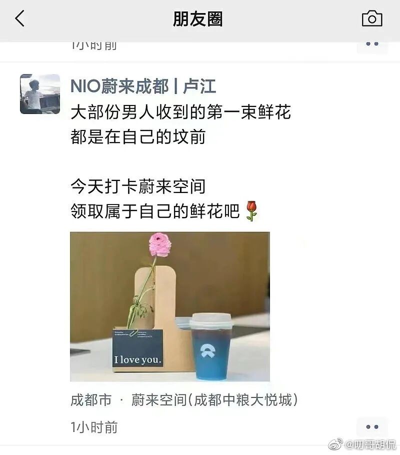 成都某蔚来门店员工情人节当天,发了条朋友圈,“大部分男人收到的第一束鲜花,都是在自己的坟前。今天打卡蔚来空间,领取属于自己的鲜花吧。”