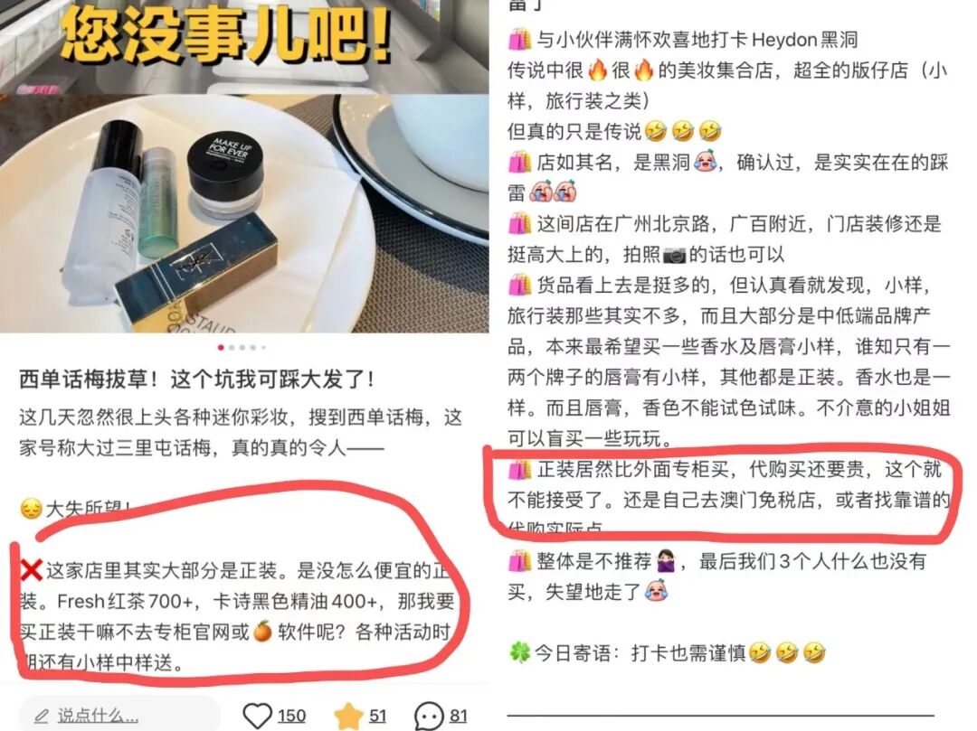 其中有网友在探店西单的话梅后发布笔记称,“这家店里(彩妆)其实大部分是正装,没什么便宜的正装,那我要买正装为什么不去专柜官网或者电商平台呢?……护肤产品基本上有小样但价格偏贵,正装看不出价格上或者服务上的任何优势,另外有些沐浴品牌在屈臣氏和莎莎都有,而且经常折扣,何必在这里买?”并表示,“我身边基本上大家都是一副来都来了的失望脸。”