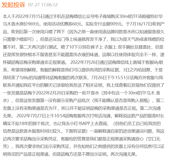也有消费者在话梅微信公众号电子商城购买了30ml的TF汤姆福特珍华乌木香水后,“怀疑话梅商店出售假货”。根据其提供的多张与话梅客服的聊天记录,上述消费者多次要求话梅提供有效的采购证据,但对方仅提供了一张发票是话梅于2022年2月20日采购的一批TF香水,“但是这张发票第一没有展示采购产品批次(我不能确认是否是我购入那瓶),第二发票上没有采购渠道是否为TF,所以并不能证明话梅的采购渠道是否正规。”