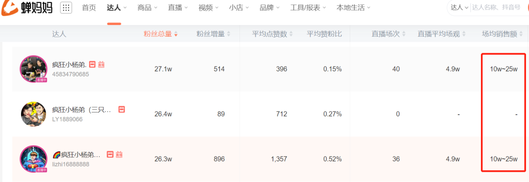 有意思的是,另外两个同用“疯狂小杨弟”命名、粉丝数量只有20多万的账号,其直播间场均销售能达到10万-25万。