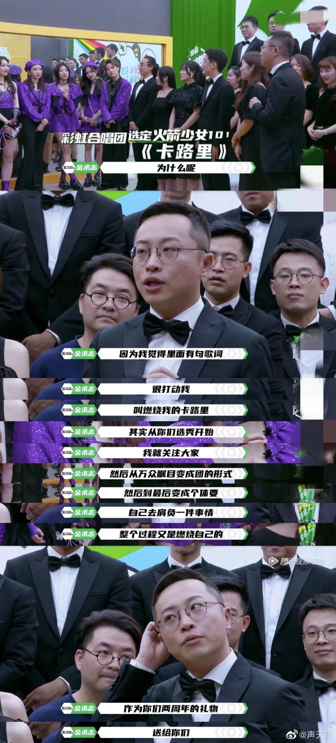 在这场告别的舞台上,印象最深刻的就是第六期上海彩虹合唱团改编《卡路里》,将燃烧脂肪的努力改成燃烧梦想的宣言,把歌曲当做毕业礼物送给火箭少女101。歌曲好听,文案也超燃!