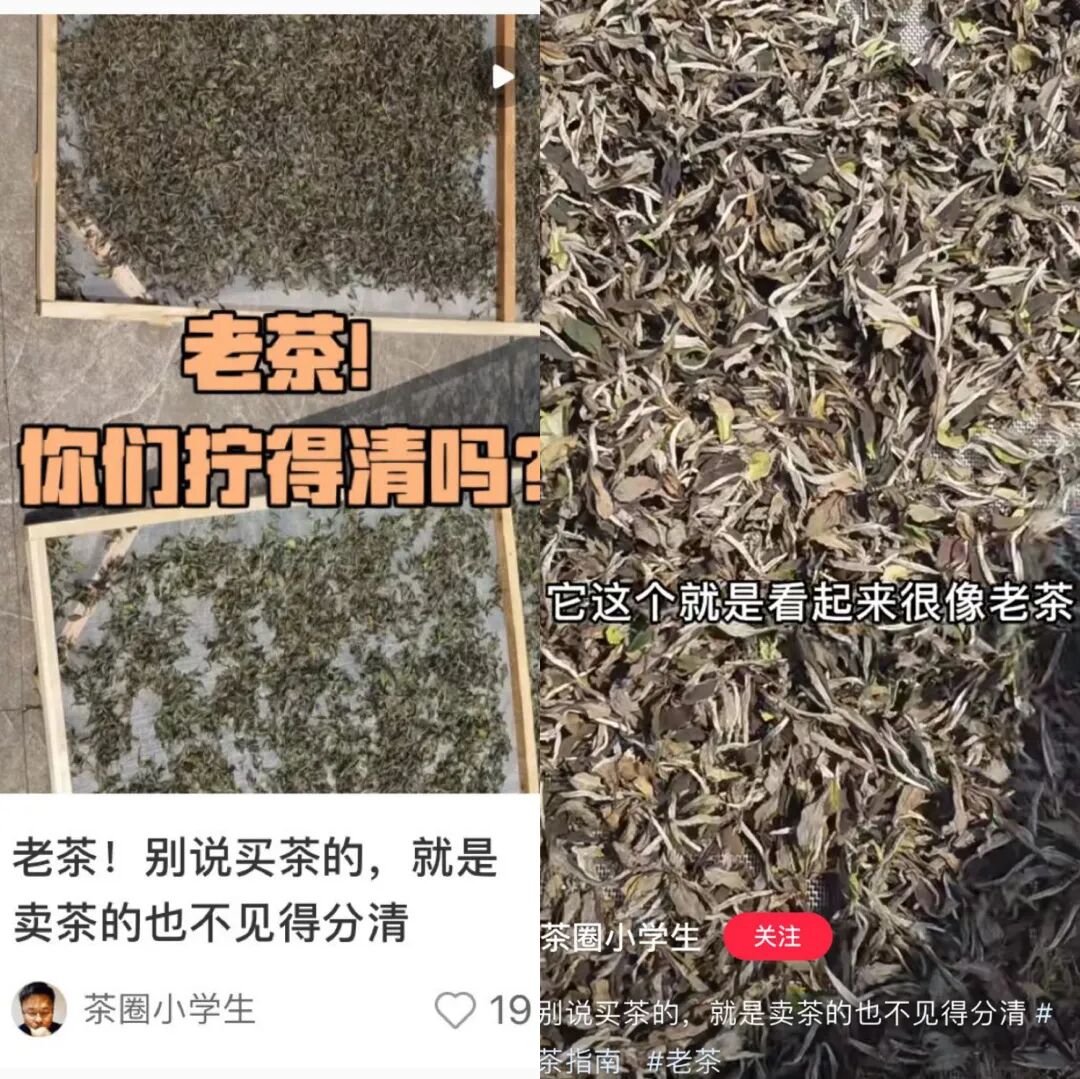 这边的博主说,你看我家这个百年古树茶,颜色多深;那边博主科普说,你看这同一批下来的茶,左边的受潮了,颜色已经深得可以冒充老茶了。