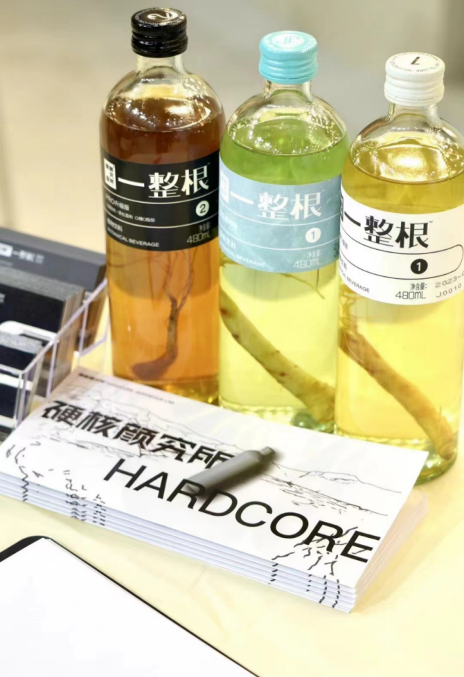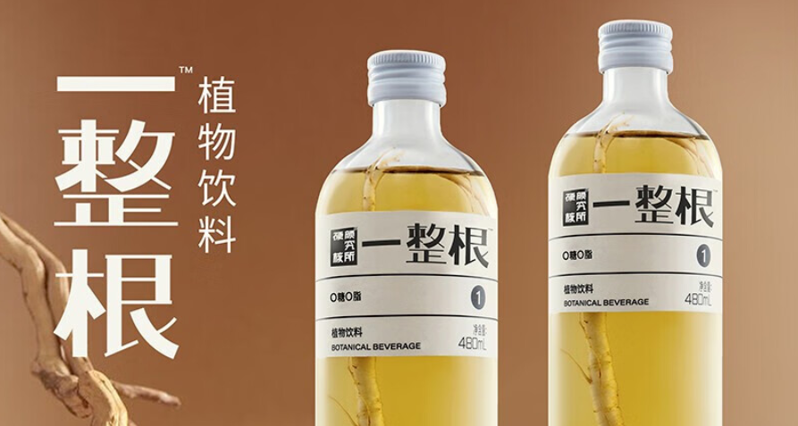 一整根是由「硬核颜究所」孵化,后者基于“不喝无用水”理念,切入厮杀激烈的水饮料市场,玻璃瓶里有一整根人参的“一整根”显然乘着这股养生热浪向年轻群体席卷,健康有营养,又能契合现代生活节奏、养生理念的新养生品牌,正赢得更多年轻人的青睐。