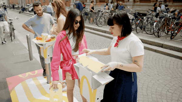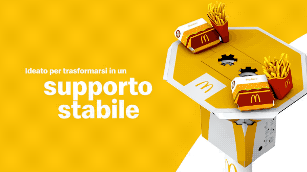 这是麦当劳推出的一款可变成餐桌的外卖袋,意在给消费者带来更加便捷以及有趣的体验。外卖袋的设计是以简洁的“黄+白”配色,以“M”LOGO为主要元素。