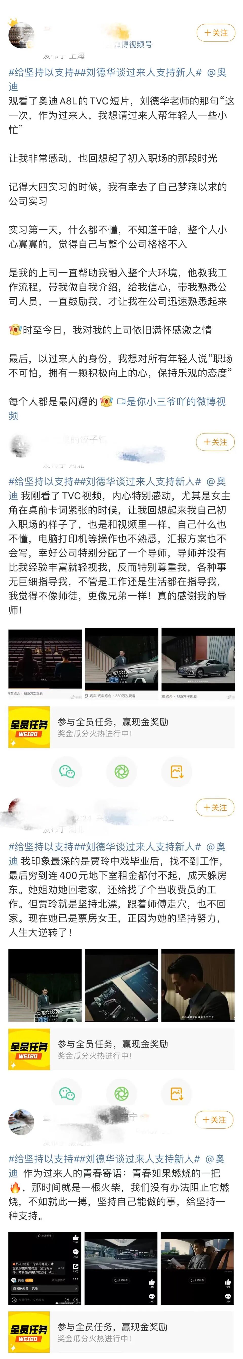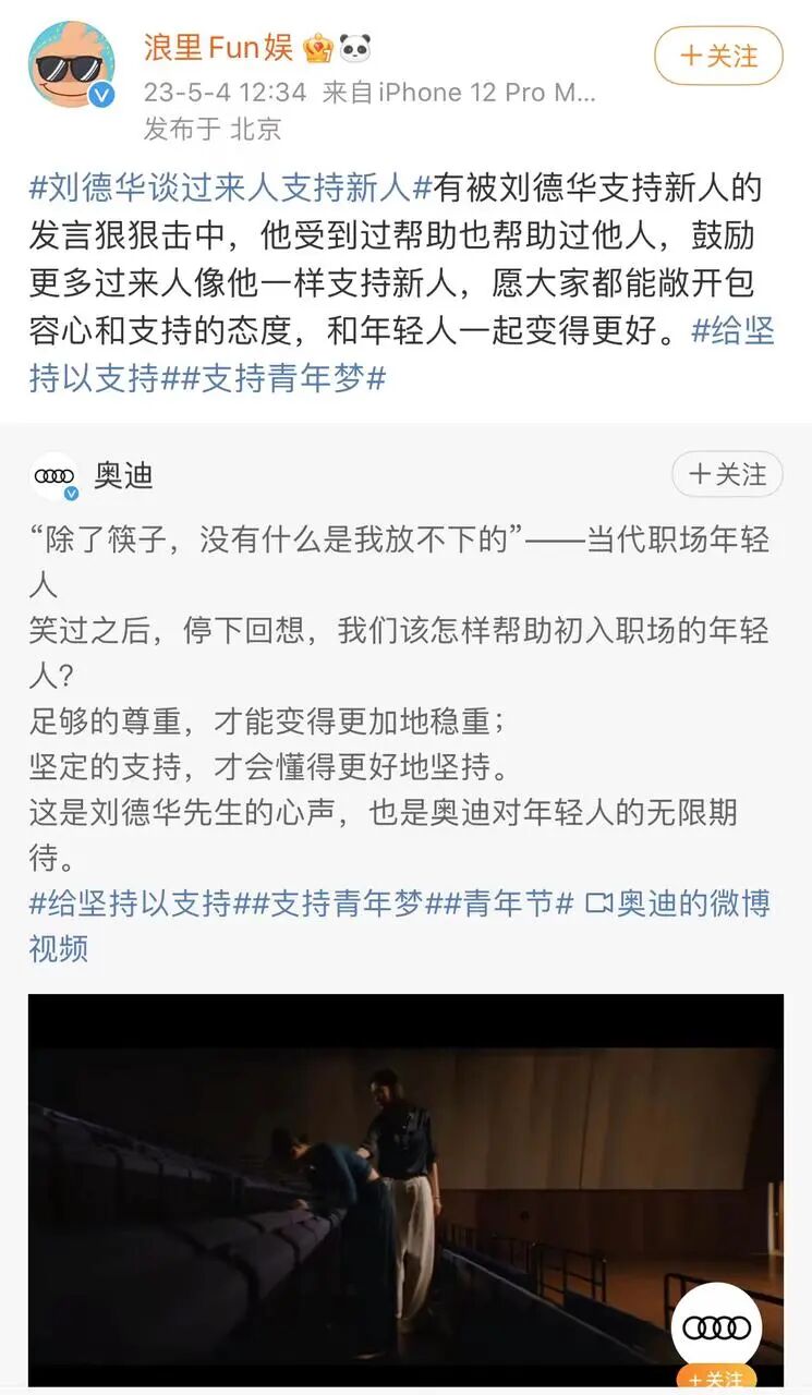 有了节日热议氛围作基础再加上刘德华天王级的明星效应,广告片一经上线便引发了网友热烈的讨论,年轻群体感触颇深,在评论区和话题中讲述自己曾在职场中受到过来人关照的暖心经历。于是,奥迪A8L打造了品牌话题#给坚持以支持#作为讨论场,捆绑#青年节#话题,将节日热度引流引至品牌话题阵地;同时借势刘德华的明星效应打造话题#刘德华谈过来人支持新人#吸引星粉讨论。