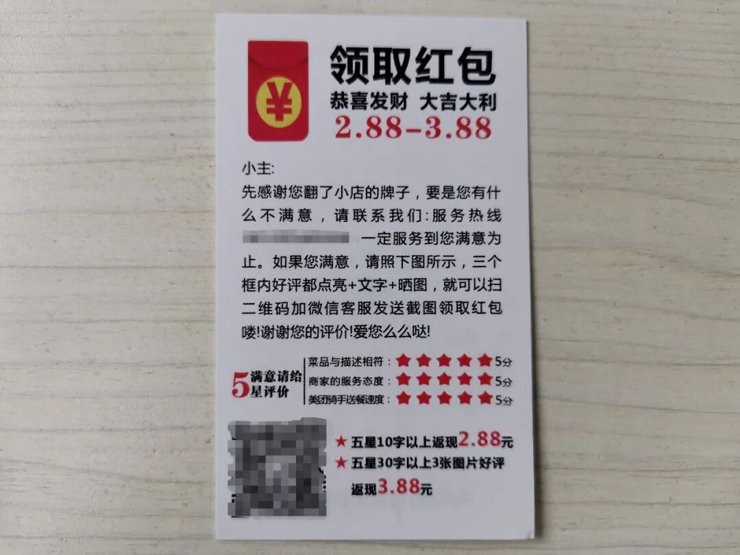 在外卖行业,好评返现似乎已经成了很多餐厅的“必备操作”,几乎每家餐厅都会在外卖里面放上“好评返现”卡,顾客对此也习以为常了。