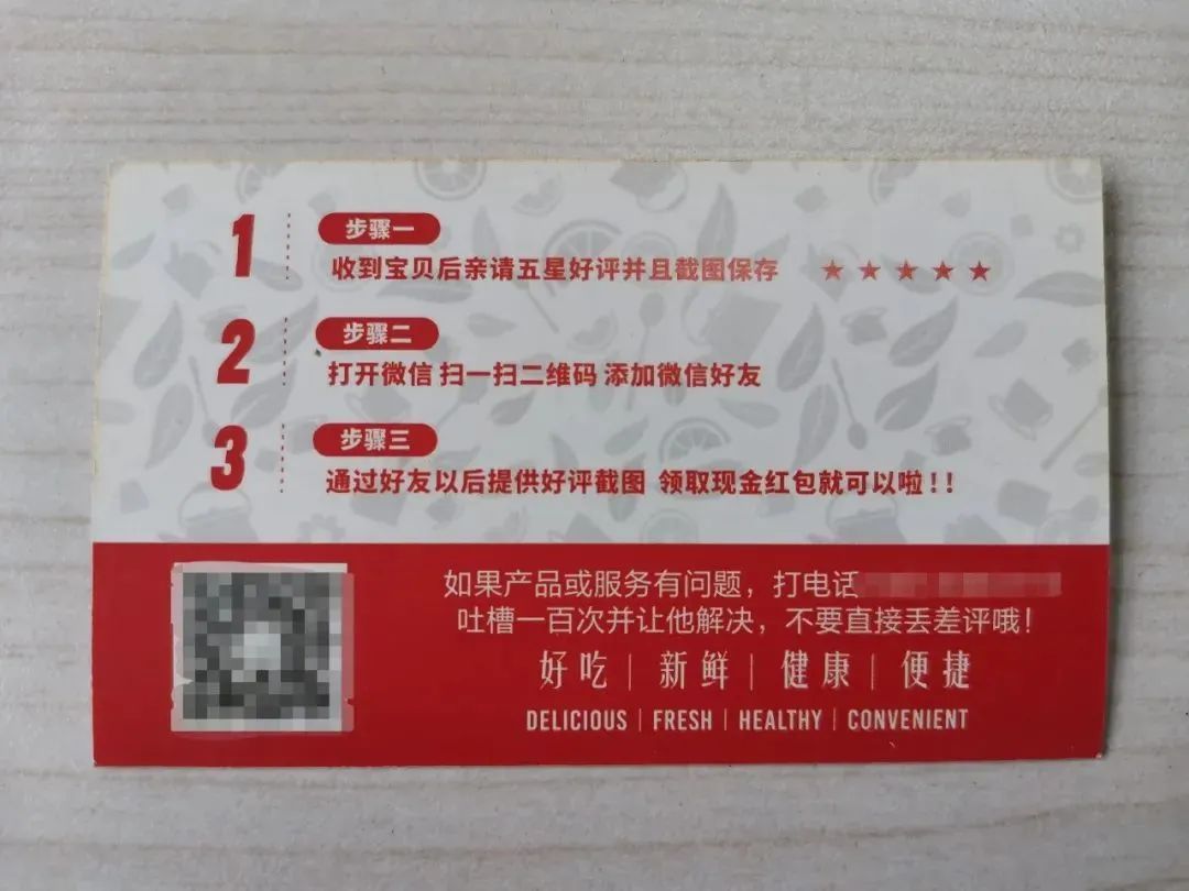 “别发好评返现卡,虚假宣传罚款20万起步,打假的打了好几家了,抓紧整改!”