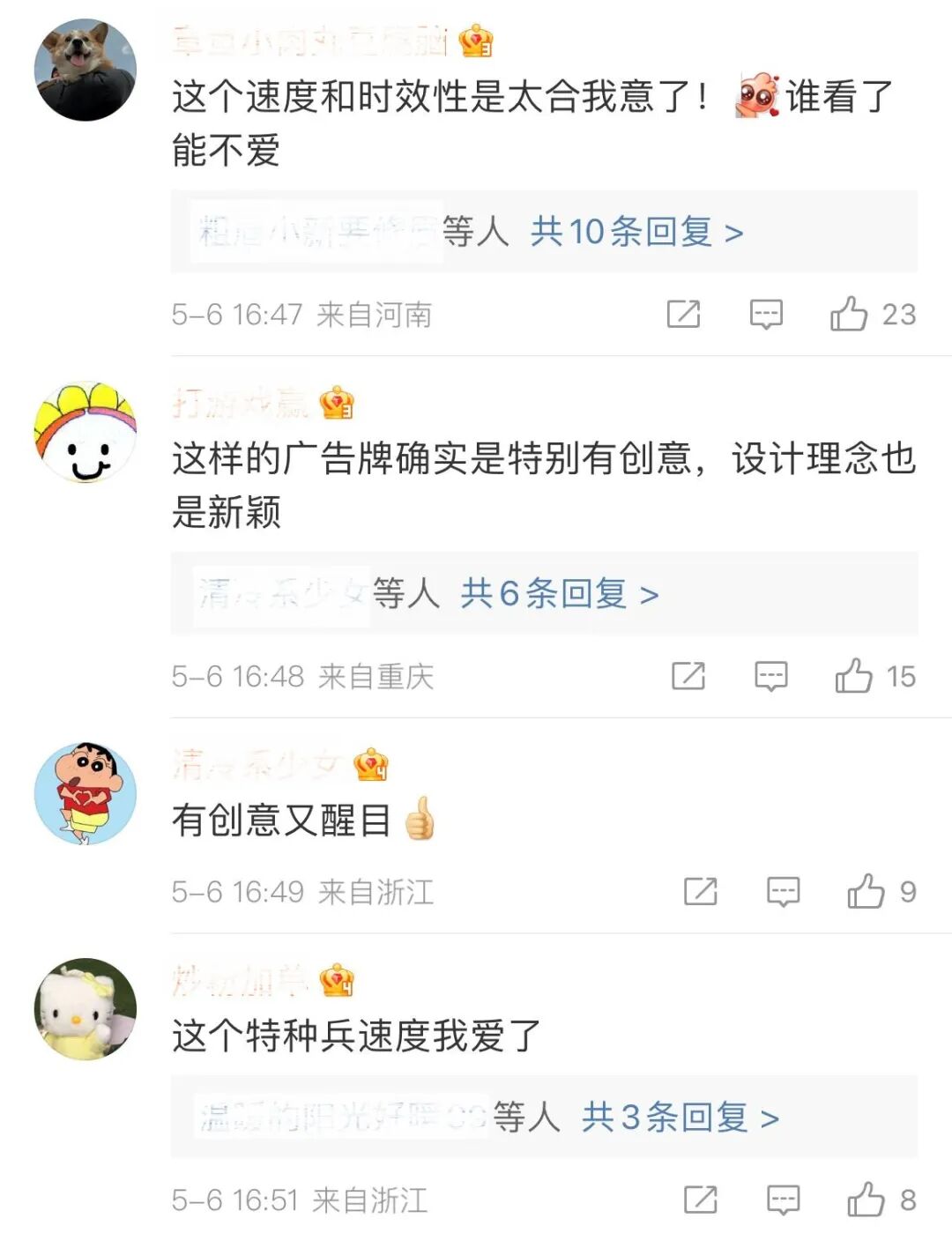 其二,营销节奏层层递进,透传天猫半日达“快”的心智认知。以广告装置吸引大众打卡、分享,成功在社交平台出圈、制造话题,再有针对性地落地各种实际活动,天猫超市的核心都在传递“半日达配送超快”这一个点,环环衔接,最终从一个广告创意,具象化成实际的服务运营,带领受众走完了“吸引、关注、分享到尝试、行动”的心路历程。