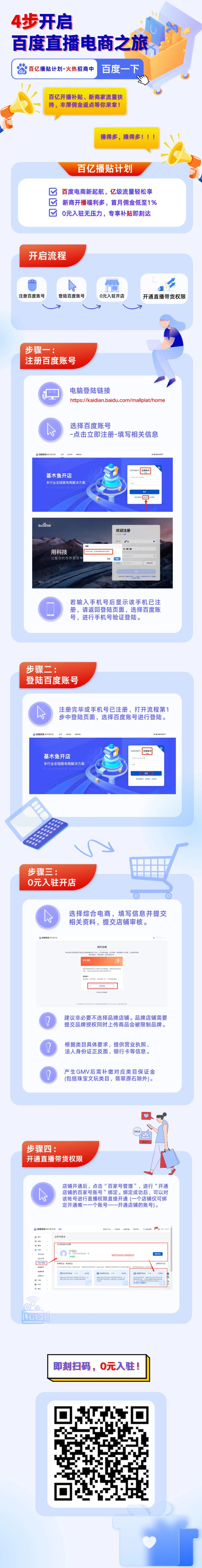 据百度电商公开招商指南,商家只需要通过四个简单步骤即可开启百度直播电商之旅。首先,在电脑端登录百度基木鱼开店页面,注册百度账号,然后,用该账号登录,其次,选择综合电商,填写信息并提交相关资料,最后,在店铺开通后,进行“开通店铺的百家号账号”绑定,绑定成功后便可开通直播权限。