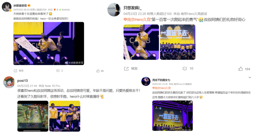 夕阳红电竞队种种热血又暖心的举动,让当天下午在正式比赛遭到“零封”的南京Hero久竞队员及粉丝都很感动,也非常认可这次友谊赛活动。