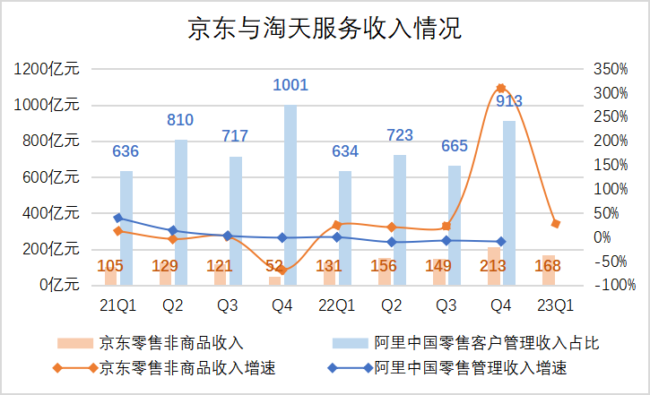 服务性收入包括来自品牌商家的佣金、广告与推广费用,亦包括88VIP这类面向消费者的会员年费。从最近几个季度财务数据可以发现,该收入一直保持较快增长趋势。今年一季度,京东零售服务收入为168亿元,同比增长28.2%,百补与开放POP的确为之提供了增量。