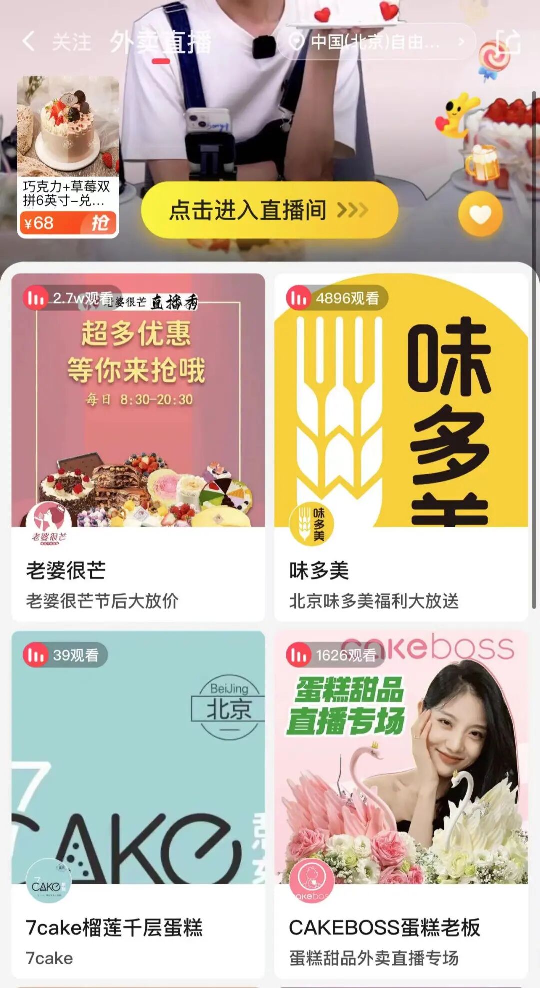 在美团App搜索“外卖直播”可以看到美团各地的分站直播间,以及部分品牌店播直播间。