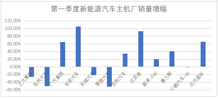图:第一季度新能源汽车主机厂销量增幅,来源:公司财报