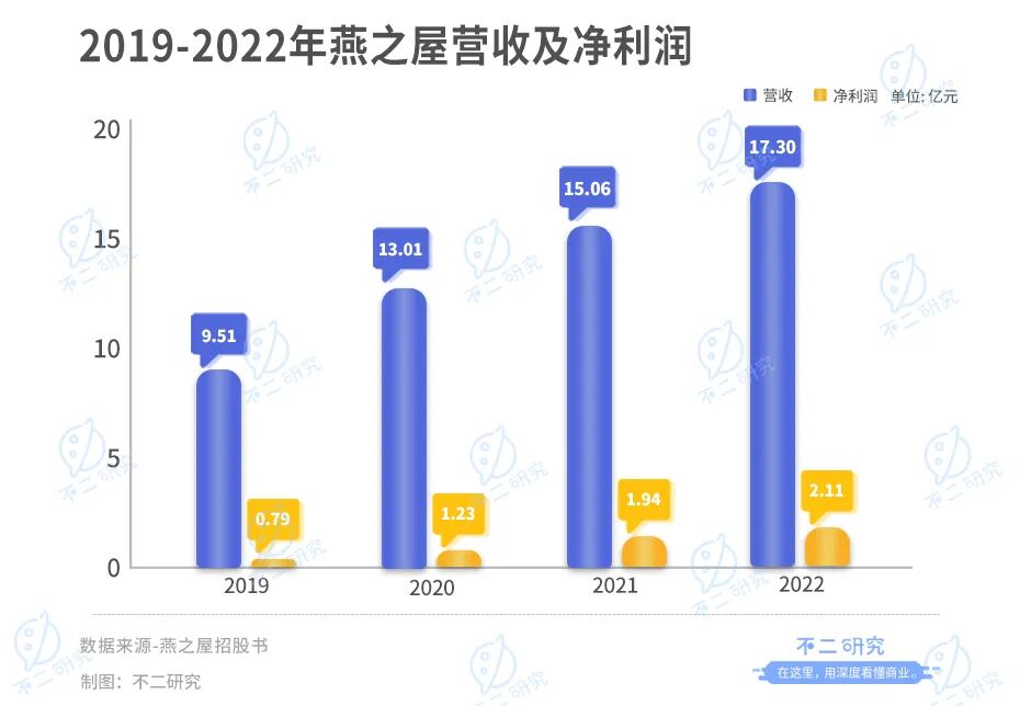 据招股书显示,2019-2022年,燕之屋营收9.51亿元、13.01亿元、15.06亿元和17.30亿元;净利润分别为0.79亿元、1.23亿元、1.94亿元和2.11亿元。