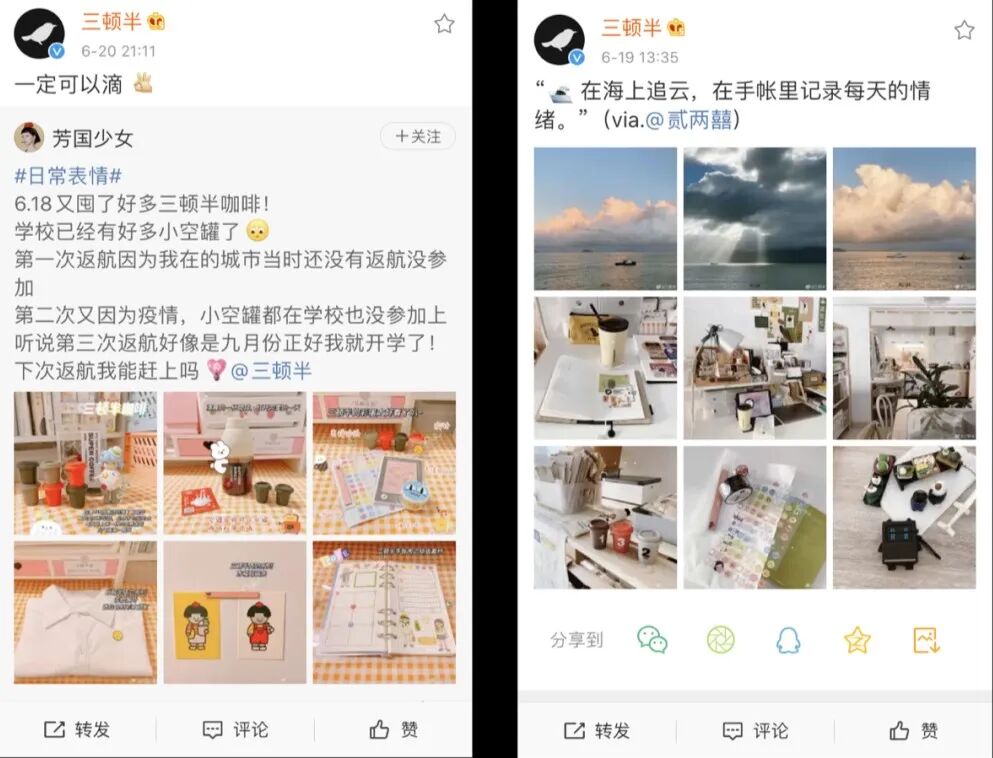 随着第三次咖啡浪潮的来袭,人们喝咖啡是一种涵盖了解咖啡及其生活方式、产品超越体验为核心的综合体验,喝咖啡日渐成为了一种生活方式的表达。作为网红品牌,三顿半自然也不例外,在品牌描述中,它的核心方向是——探索咖啡新的商业模式,构建基于生活方式的下一代咖啡生态系统。在微博、小红书等社交平台上,三顿半更像是一位生活方式博主,通过收集、记录和分享用户晒出产品的照片和帖子,和消费者互动,使这些内容最终成为其品牌故事的一部分。