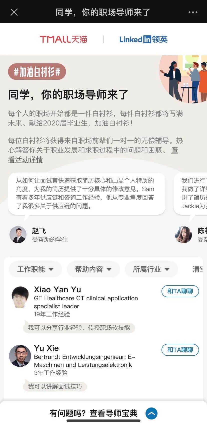 此外,天猫还与职场社交平台领英开辟了天猫职场导师专场,邀请了在各行各业有多年工作经验的职场大咖,与大学生们一起探讨就业求职小技巧,还可以提供“简历诊断”“职场软技能”“面试技巧”“行业分享”等“干货知识”,为毕业生加油打气。