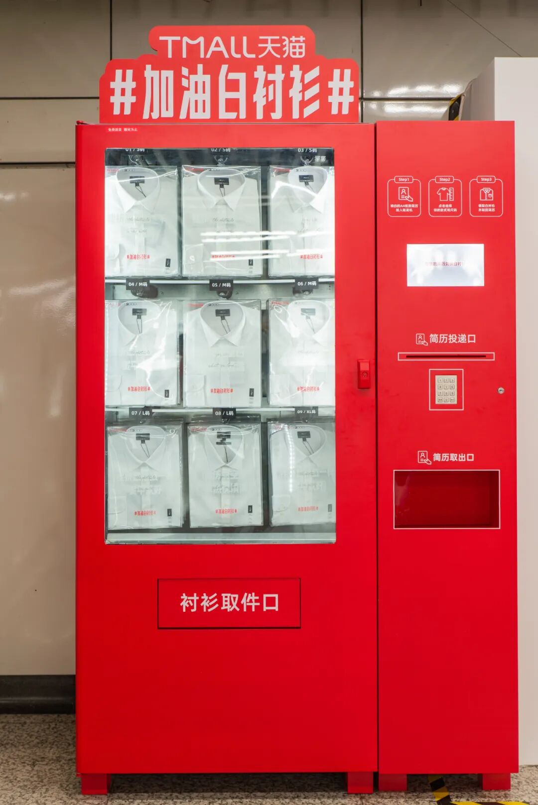 在展览现场,天猫还安排了一台特殊的白衬衫贩卖机。毕业生把简历投进去,就可以选择自己的款式尺码,免费获得一件白衬衫。这一贴心的创意互动,对于毕业生来说更是莫大的鼓舞和激励,他们可以把这件“白衬衫”作为战袍,去求职面试,用更大的自信和勇气面对未来的人生挑战。