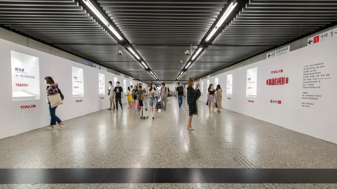 线上video赚足眼泪,线下展览必须到位。除了走心的创意短片,天猫在线下承包了徐家汇地铁站的上海交大出口,以包站改造的形式,办了一场特殊的“白衬衫”展览。