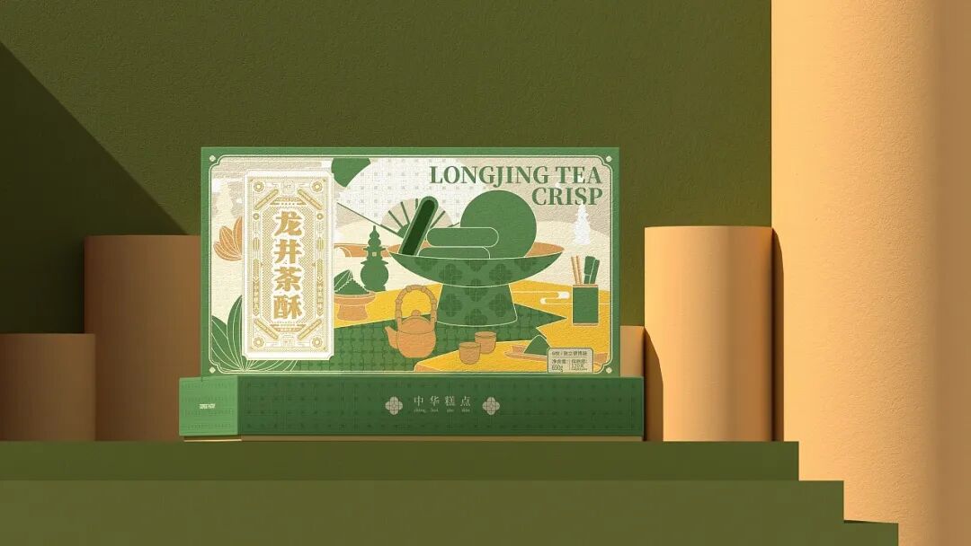 最后这款中华糕点系列,整个画面内容采用一致的中式茶食场景进行绘制,并根据太阳饼、龙井茶酥、凤梨酥等不同产品做对应的主题输出,打造更沉浸式的场景体验,同时直观展示产品属性,便于用户区分。