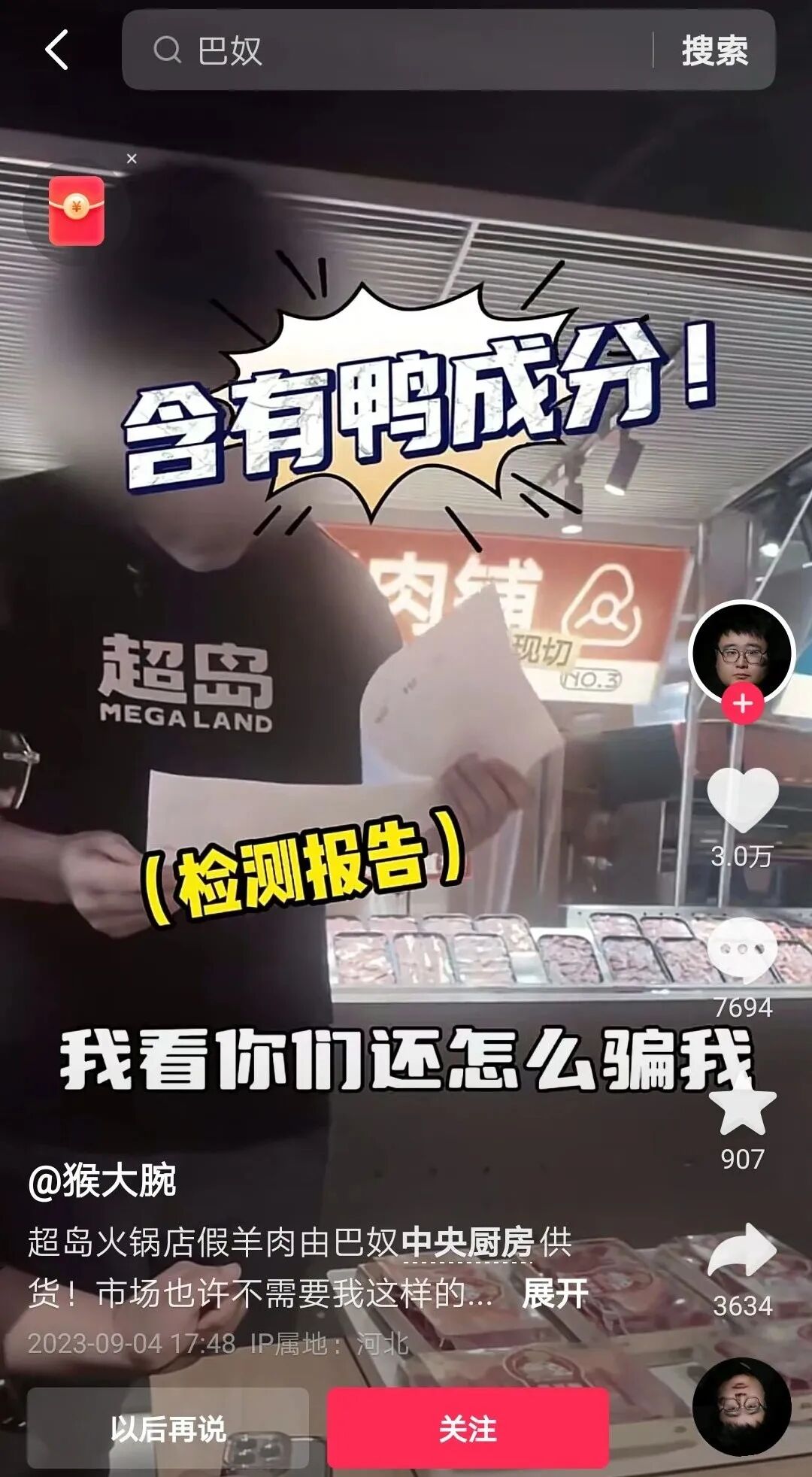 在上个月某博主曝光了张亮麻辣烫门店存在售卖假羊肉卷情况后,9月4日,又有一位博主@猴大腕 发布视频称,北京合生汇超岛火锅店售卖“假羊肉”,售价约80元一斤。
