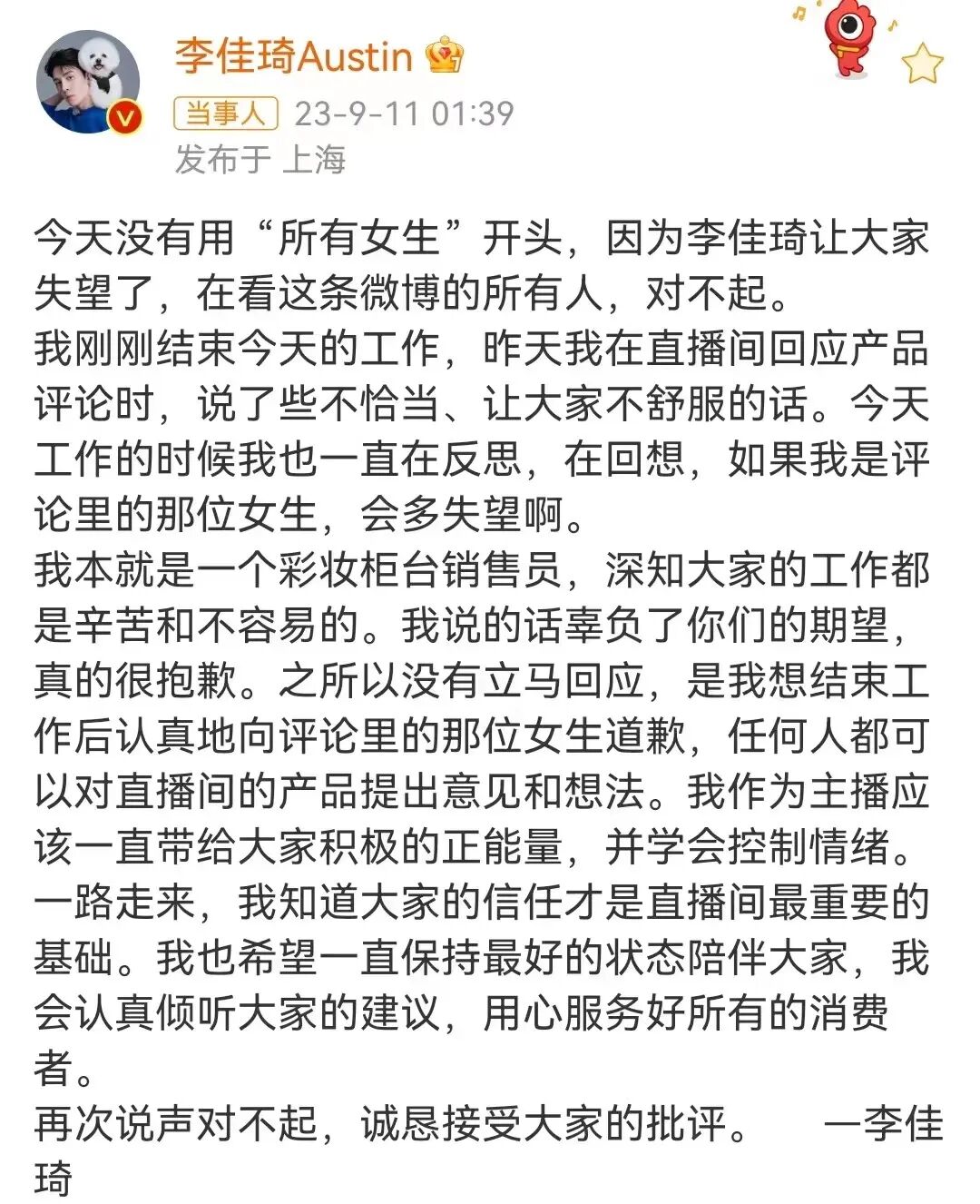 李佳琦团队没有气馁,深夜1点多发布了正式道歉声明:让大家失望了,对不起。